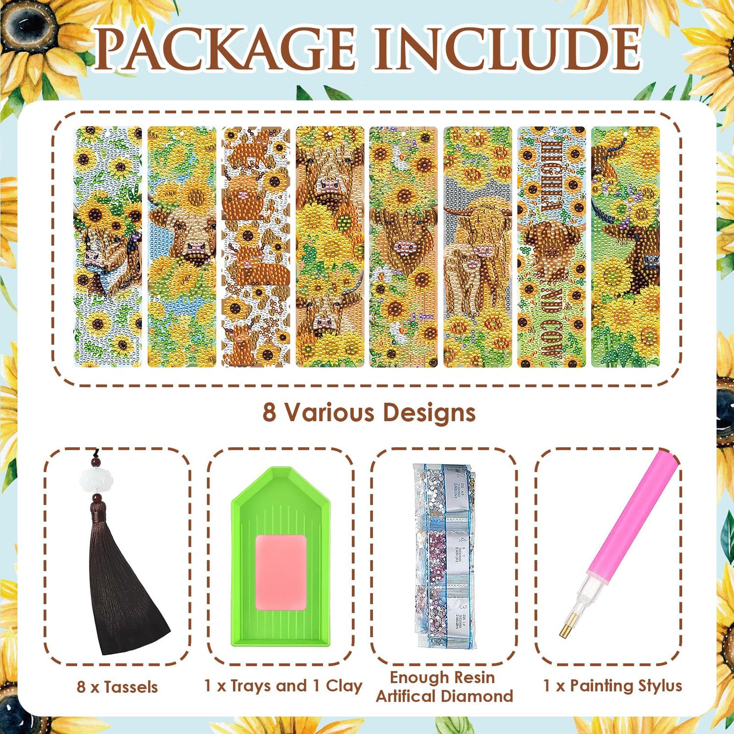 INCOK Diamond Painting Bookmarks Set - 8PCS Highland Cow 5D Diamond Art Bookmarks Kit with Tassel Sunflower Bookmarks Set for Highland Cow Lover Office Useful Project DIY Crafts Gifts Teacher