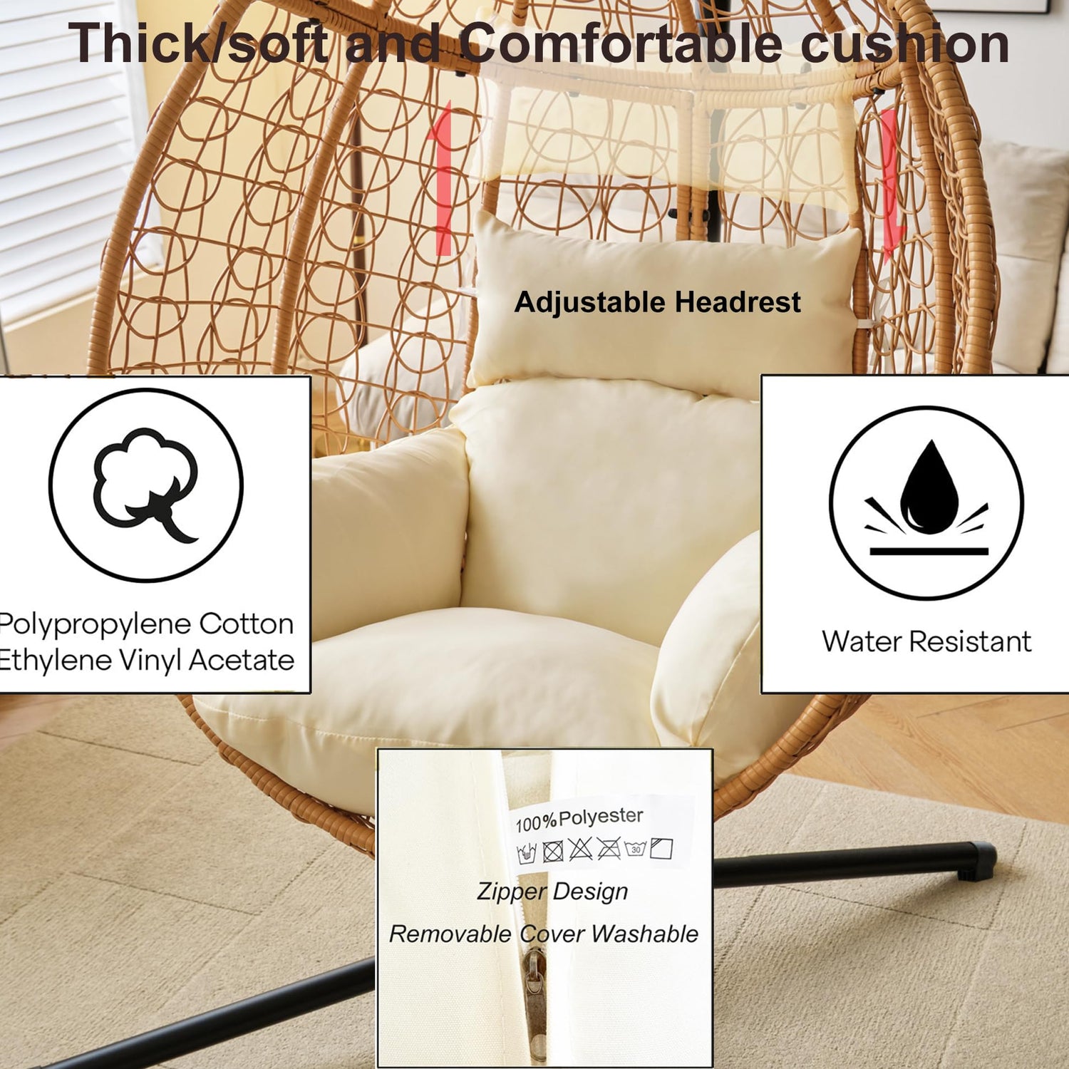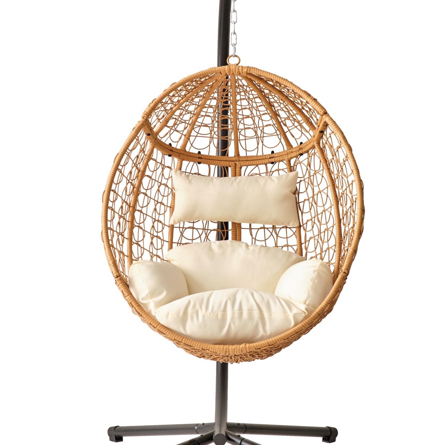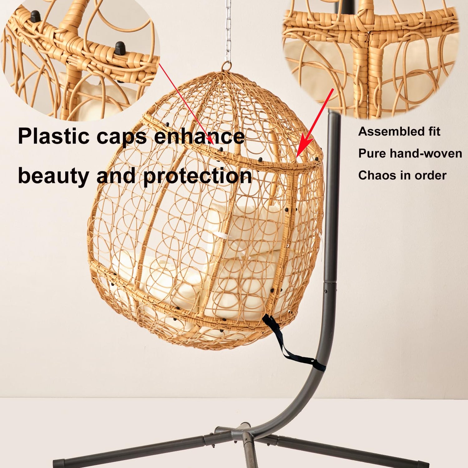 - Durability and Weather Resistance: The hanging egg chair with stand, constructed with robust steel tubing and UV-protected polyethylene resin rattan, is built to last. It resists weather, corrosion, and can endure various outdoor conditions, ensuring long-lasting durability.