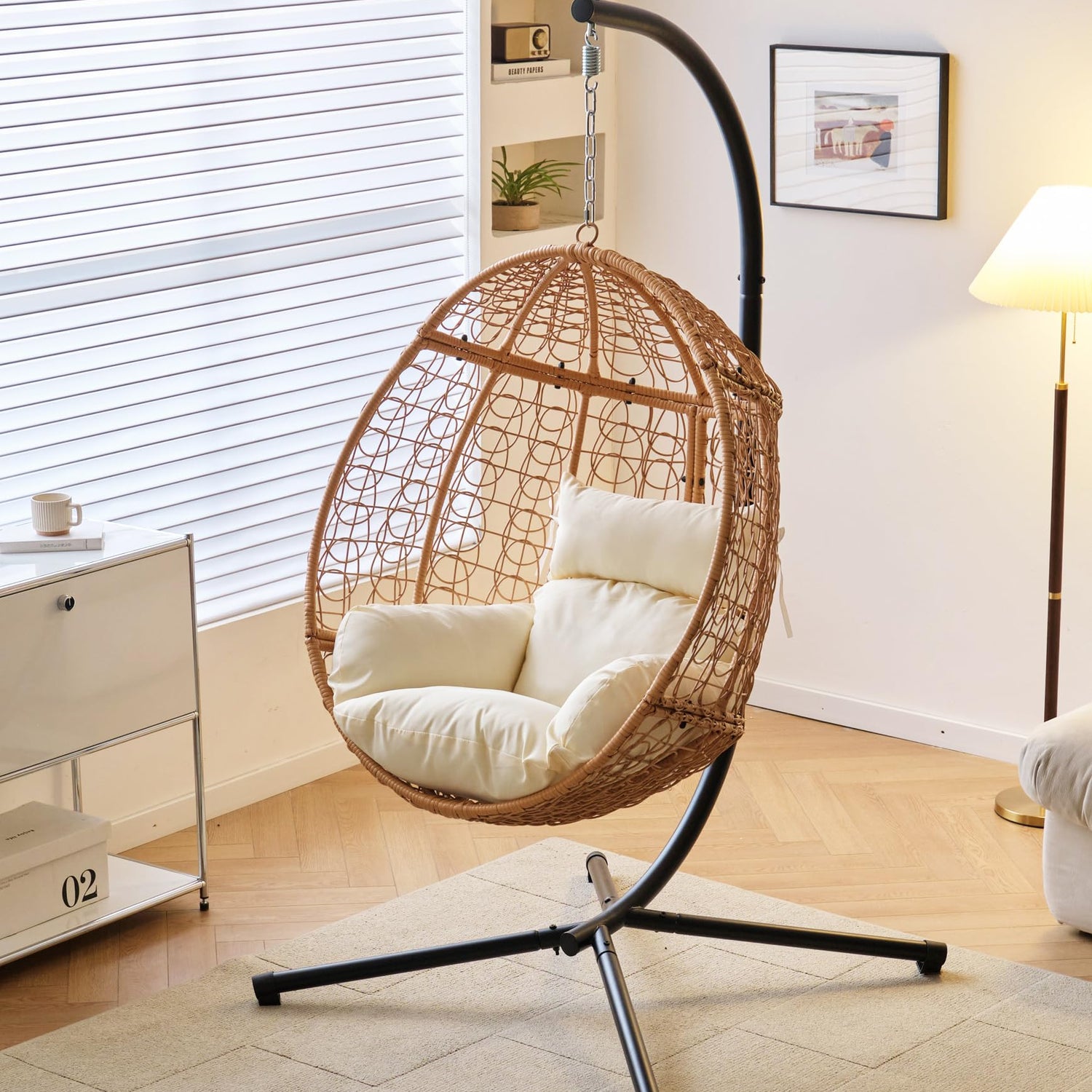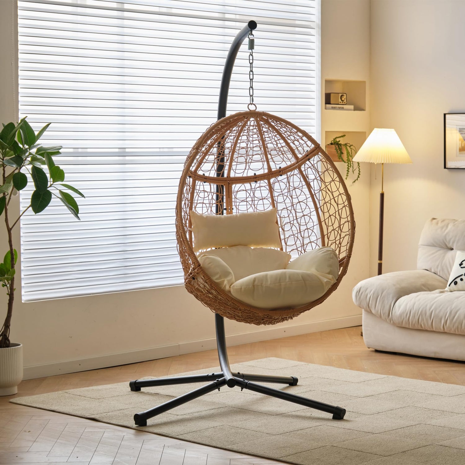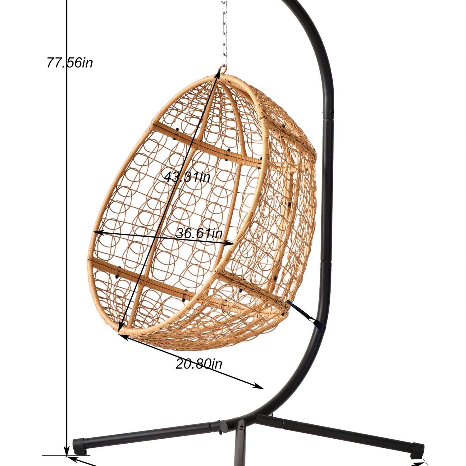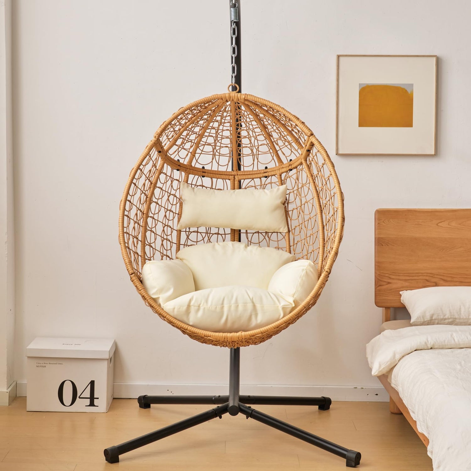 - Durability and Weather Resistance: The hanging egg chair with stand, constructed with robust steel tubing and UV-protected polyethylene resin rattan, is built to last. It resists weather, corrosion, and can endure various outdoor conditions, ensuring long-lasting durability.