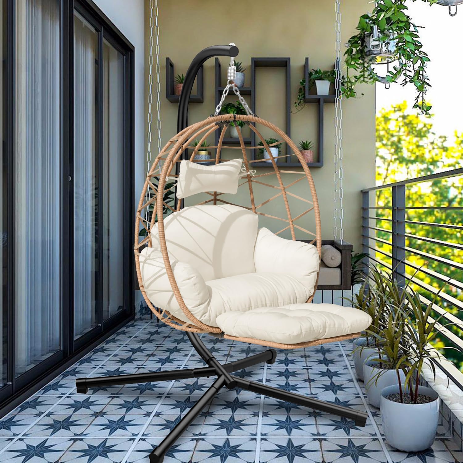 - Sturdy & Weather-Resistant Construction – Built with rust-proof aluminum-steel frame and handwoven PE rattan, this hanging egg chair withstands harsh weather while offering long-lasting durability. The reinforced stand ensures stability on any surface, supporting up to 350 lbs for safe indoor/outdoor use.