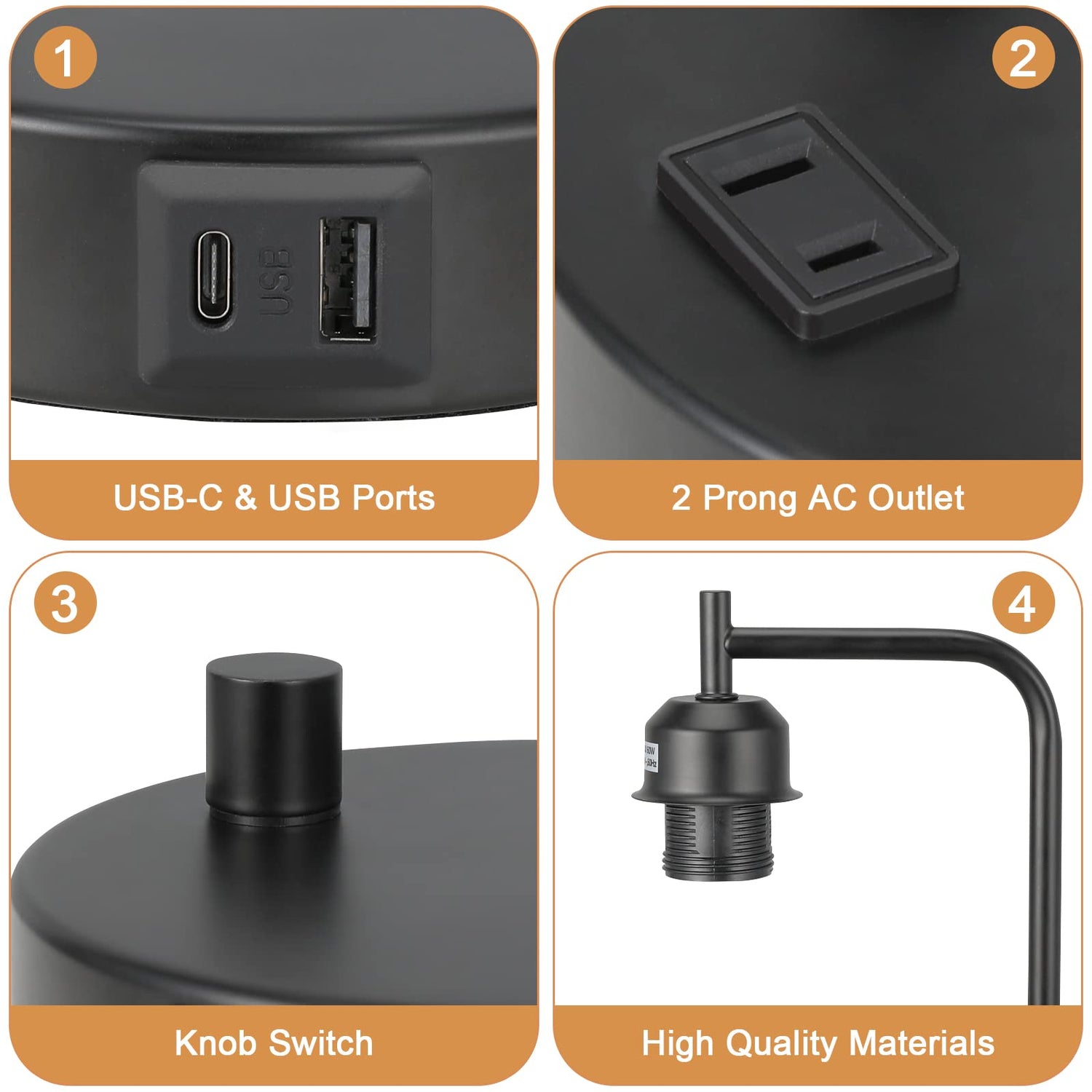 - USB-C & USB & AC OUTLET CHARGING PORTS - The farmhouse bedside lamp with usb port integrated with a USB-C port, a USB port and a 2-prong AC outlet (5V/2.1A), which are available for use whether the industrial lamp for nightstand is on or off. With that you'll have an easy access to charge mobile phones, tablets, kindle readers, power banks, e-watch, mini-humidifier and others