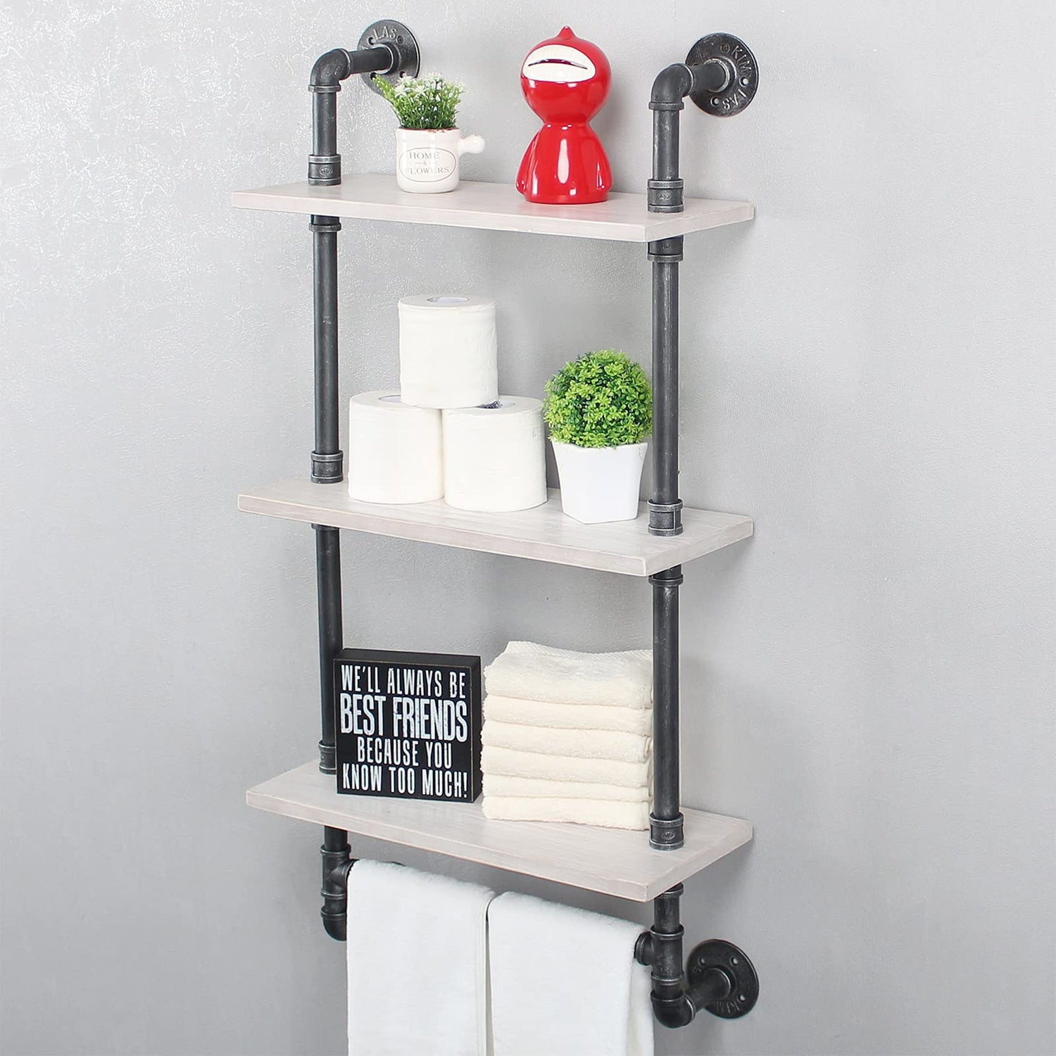 Details: Industrial Pipe Shelf Bathroom Shelves Wall Mounted,19.6in Rustic Wood Shelf with Towel Bar,3 Tier Farmhouse Towel Rack Over Toilet,Pipe Shelving Floating Shelves Towel Holder,Retro White