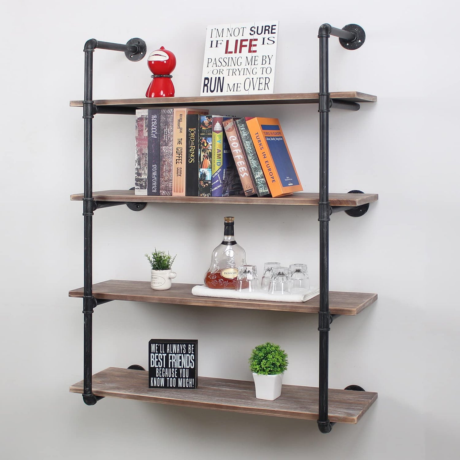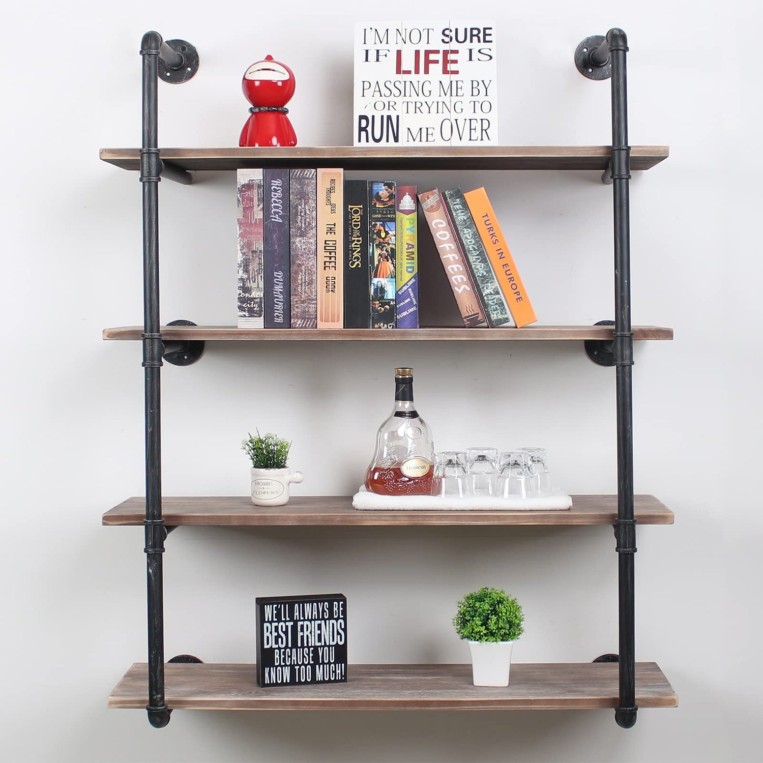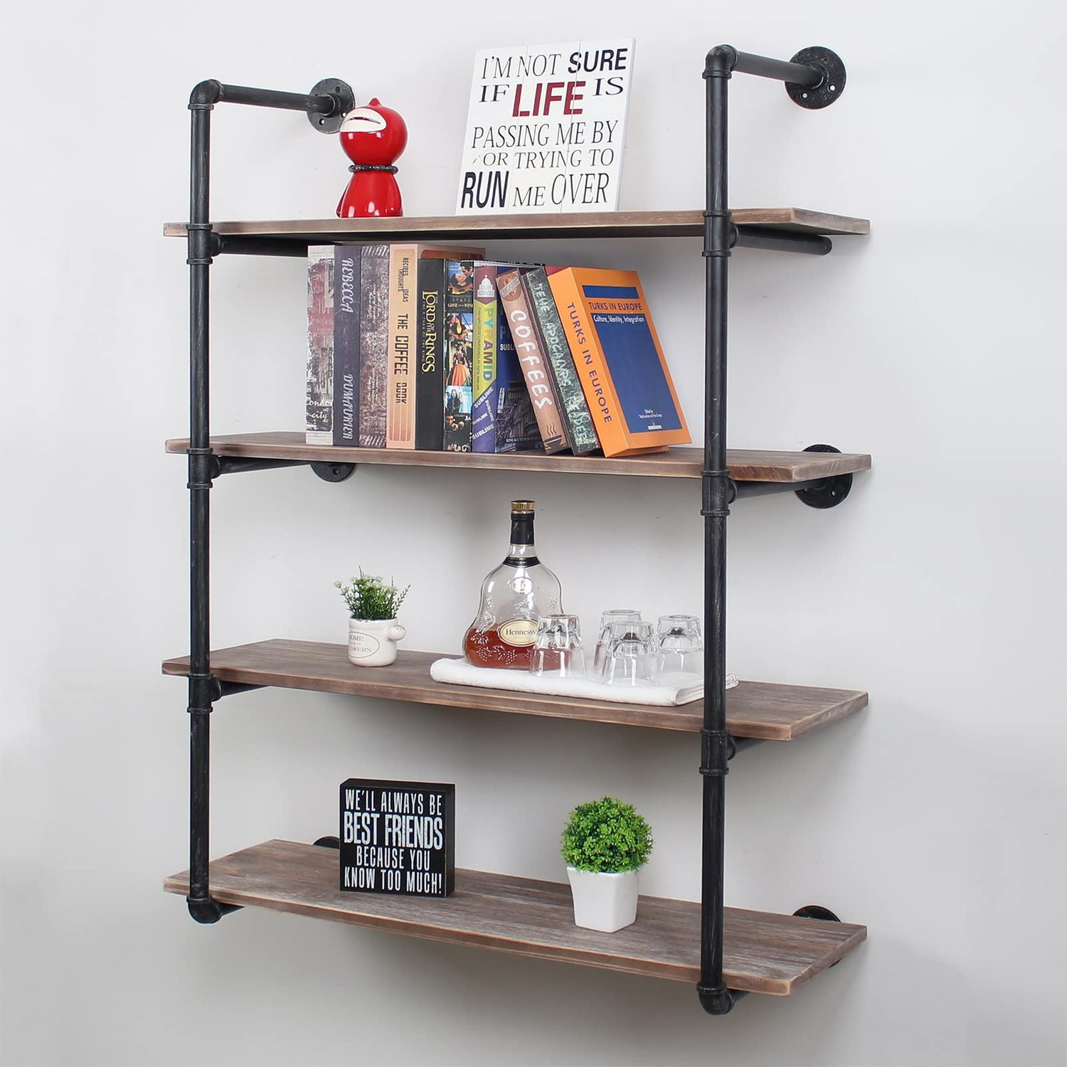 Industrial Pipe Shelving Wall Mounted,48in Rustic Metal Floating Shelves,Steampunk Real Wood Book Shelves,Wall Shelf Unit Bookshelf Hanging Wall Shelves,Farmhouse Kitchen Bar Shelving(4 Tier)