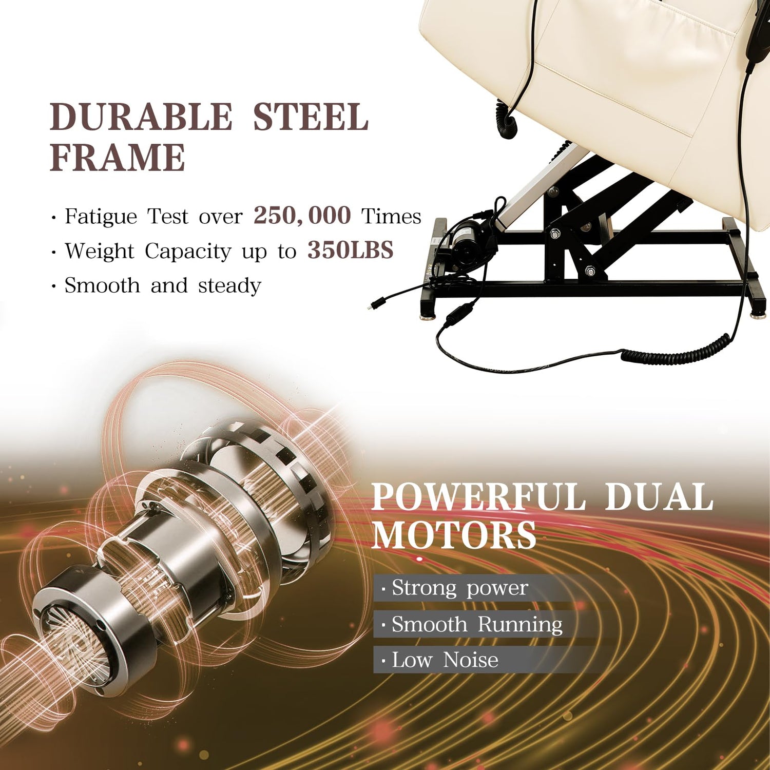 Infinite Position Lay Flat Lift Recliner Chair for Adults, Dual Motor Power Lift Chair for Elderly with Massage & Heating, Extended Footrest, USB Ports, Remote Control & Lumbar Pillow, Leather (Cream)