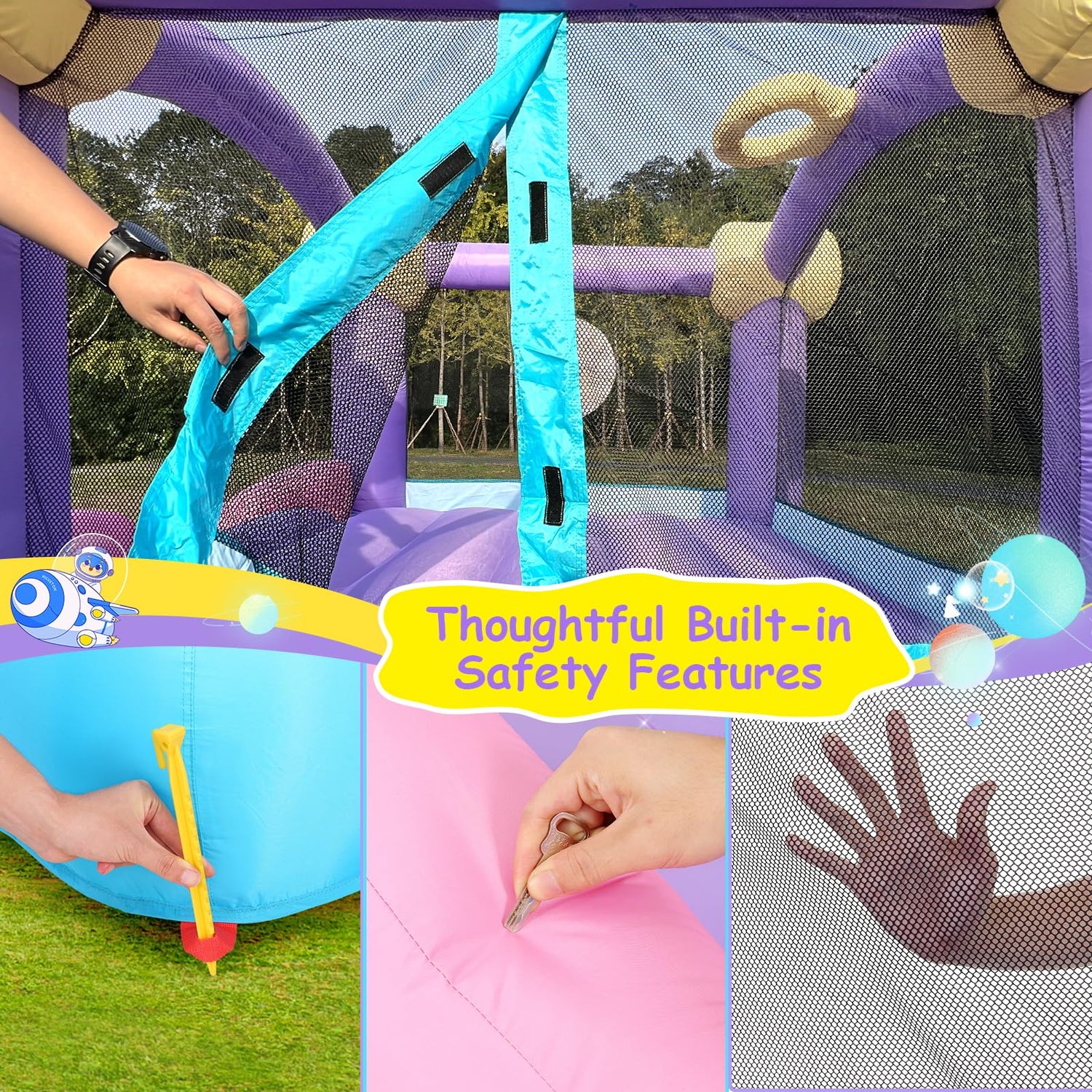 - 🟪【Built-in Safety Features】① The jumping area is surrounded by 3 sides of mesh safety netting to protect your children from falling while jumping and ensures maximum ventilation as well. ② an extra-long fill tube that keeps the blower a decent distance from the bounce house. ③ two mesh storage pockets on the side for shoes, water or snacks, we encourage barefoot jumping, which can help prevent falls and twisted ankles. ④ Comes with 6 bounce house stakes and 2 blower stakes firmly anchor the bounce house to the ground when outside, prevent it from tipping over during energetic play