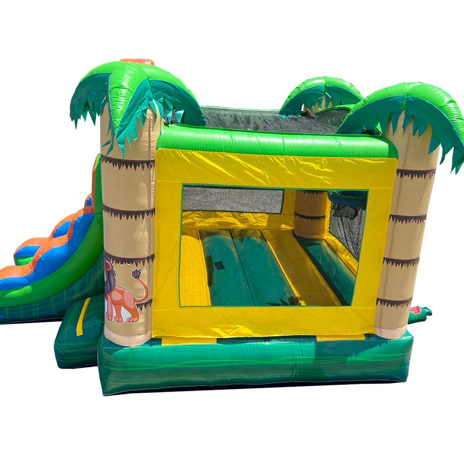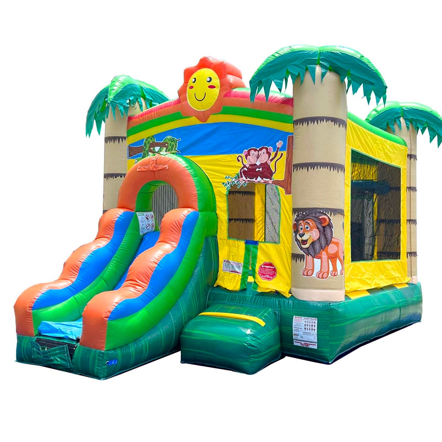 - UNLEASH YOUR WILD SIDE: Our tropical smiley face castle inflatable bounce house has a spacious 12' x 12' bounce area with a built in basketball hoop and a slide for kids that can be used wet or dry. Our outdoor toys are ideal for encouraging outside play and exercise. Important: This unit requires a 950 watt air blower for use