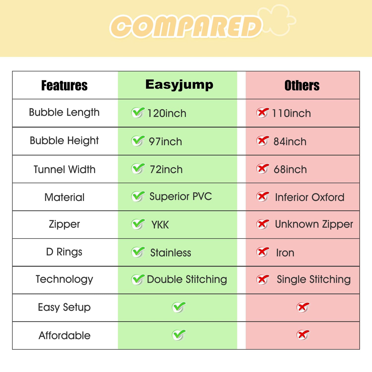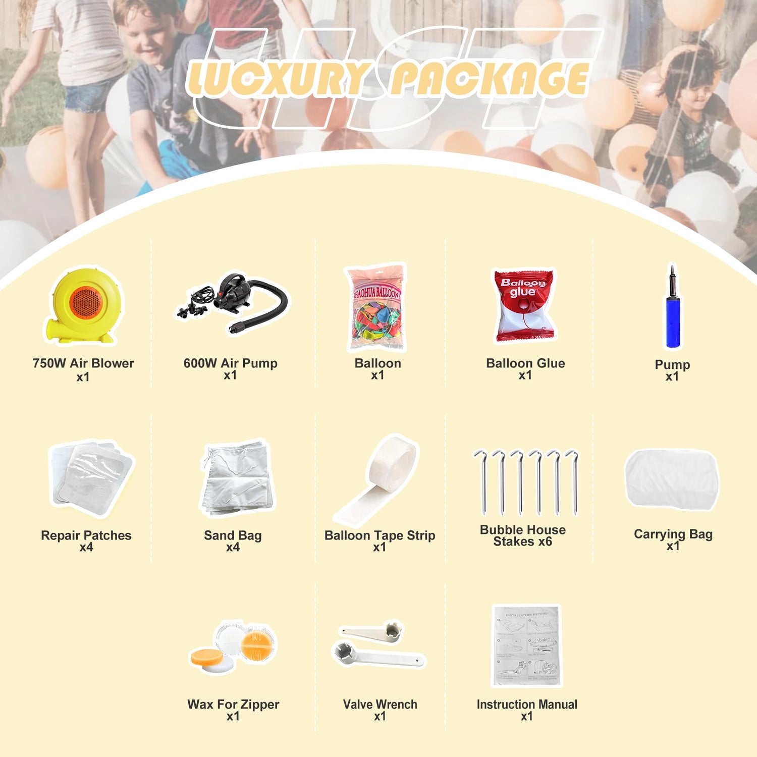 - [Better for Celebrations] Elevate your kids' birthdays and special events with our dome bubble tent! It promises endless hours of entertainment and excitement. Its unique shape and exquisite materials make it glisten like crystal in the sunlight, creating the ultimate party centerpiece. Size: Bubble 10 FT (Diameter) x 8 FT (Height)+ Tunnel 6 FT. Luxury Accessories Included: Air blower, electric pump, repair kit, wax, balloon, balloon glue, hand pump, sandbag, tape, carrying bag, stakes, manual.
