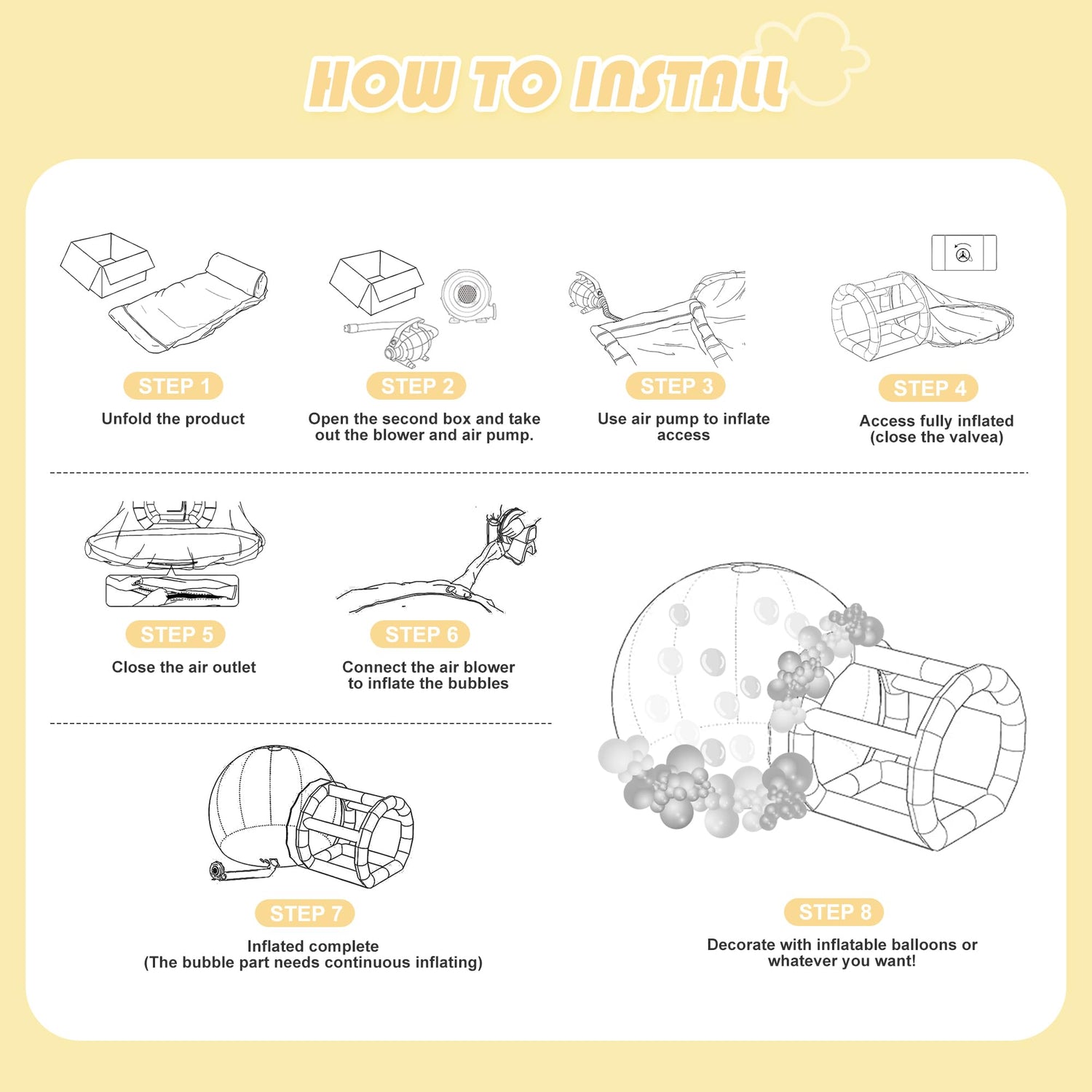 - [Ideal for Both Indoor and Outdoor Events] Embrace the latest trend in party and event hosting! Our versatile bubble tent caters to both kids and adults. Its transparent design acts as a blank canvas for a myriad of creative themes, limited only by your imagination. Before storing inflatable products, ensure a thorough wipe-down and store them in a cool, well-ventilated space.