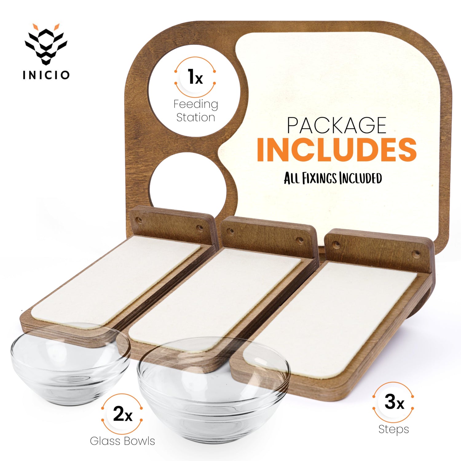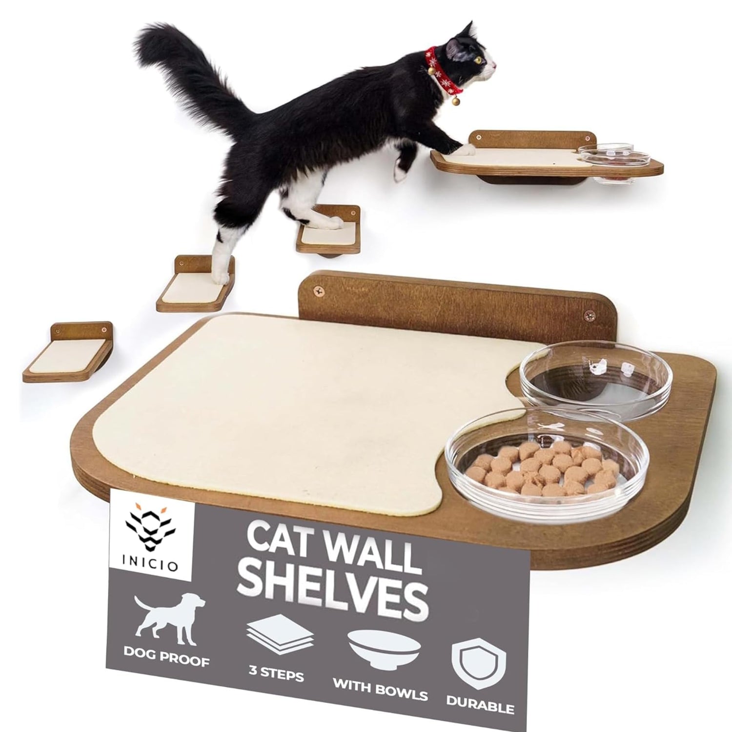 INICIO Cat Wall Shelves – Dog Proof Feeding Station with Wall Mounted Shelves, Durable 3 Step Birch Floating Shelf for Cats Up to 17lbs, Includes Attached Cat Food Bowl for Convenient Feeding – Brown