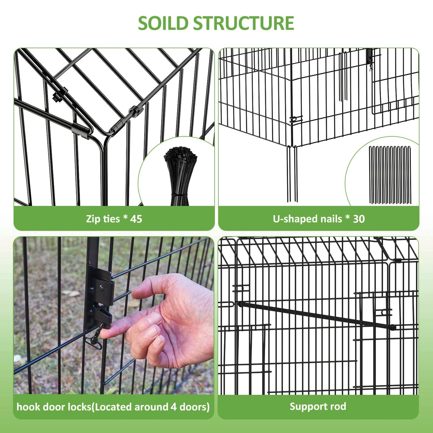 - Solid Structure: Rustproof coating on every wire of the chicken coop, effectively extending the service life. The coop is equipped with 45 cableies and 30 6-inch ground nails that grip the ground firmly, making the poultryw fence more stable and sturdy
