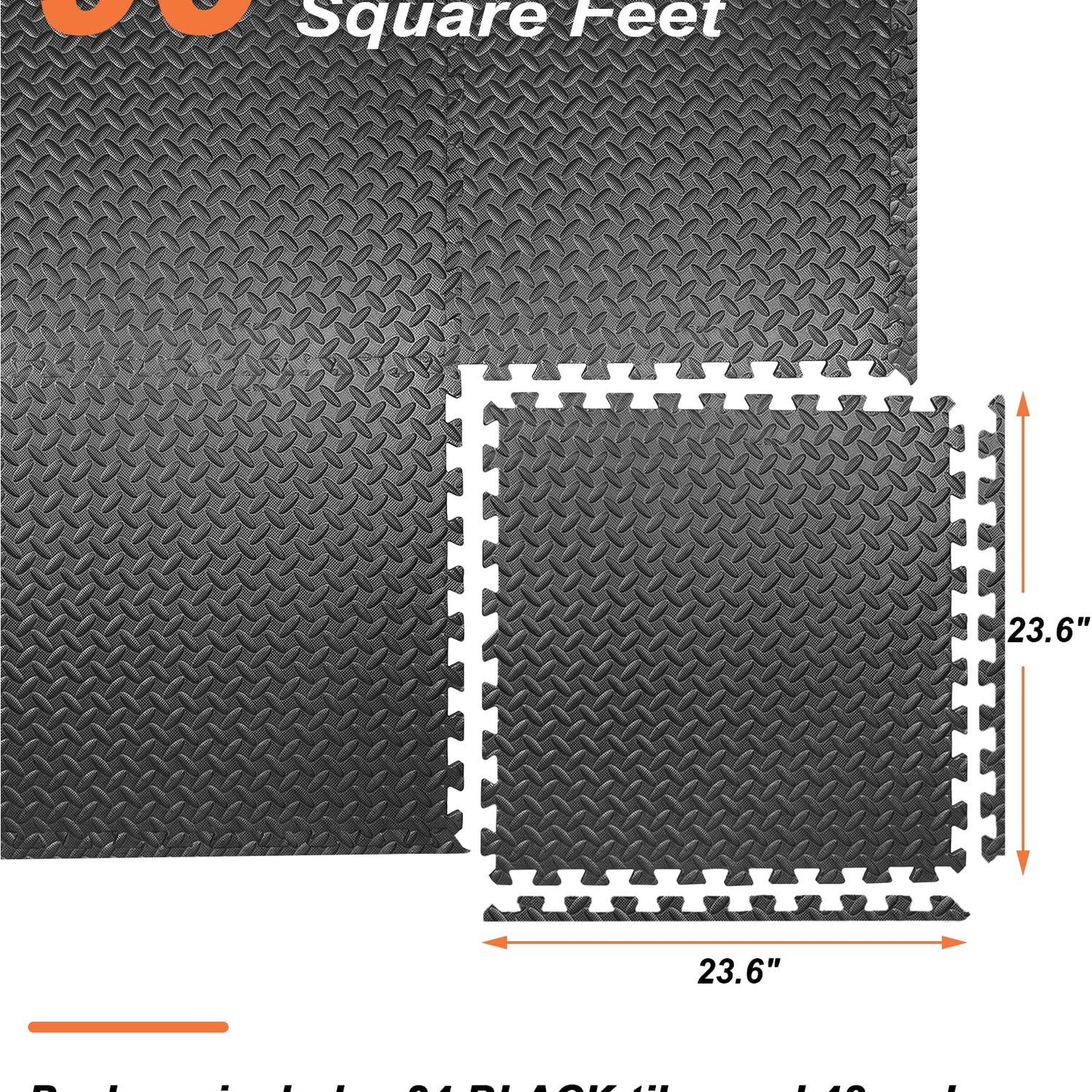 - Gym Floor Mats Cover 96 SQ. FT: Each foam floor tile measures 23.6 inches x 23.6 inches x 3/8 inch (600mm x 600mm x 10mm). Package includes 24 BLACK interlocking foam tiles and 48 end borders for a seamless appearance. Gym flooring cover up to 96 sq.ft of floor space, making it a perfect workout and training accessory.