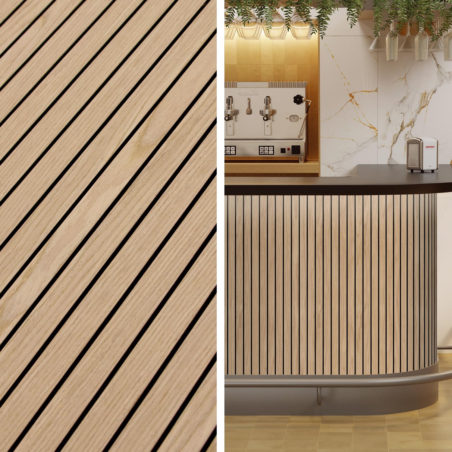 Details: With INNO STICKERS's range of ready-made acoustic wood paneling, you can make any wall a work of art. Made from contemporary grade wood veneer that's been carefully chosen for its consistency and character, all our slatted wall panels are cut and oiled by hand in our workshop and with each panel pre-bonded to a rigid recycled felt backing, INNO STICKERS promises soundproofing that's second to none. Elevate your environment with our innovative 3D Acoustic Slat Wood Wall Panels for a distinctive blend of aesthetics and acoustic performance.