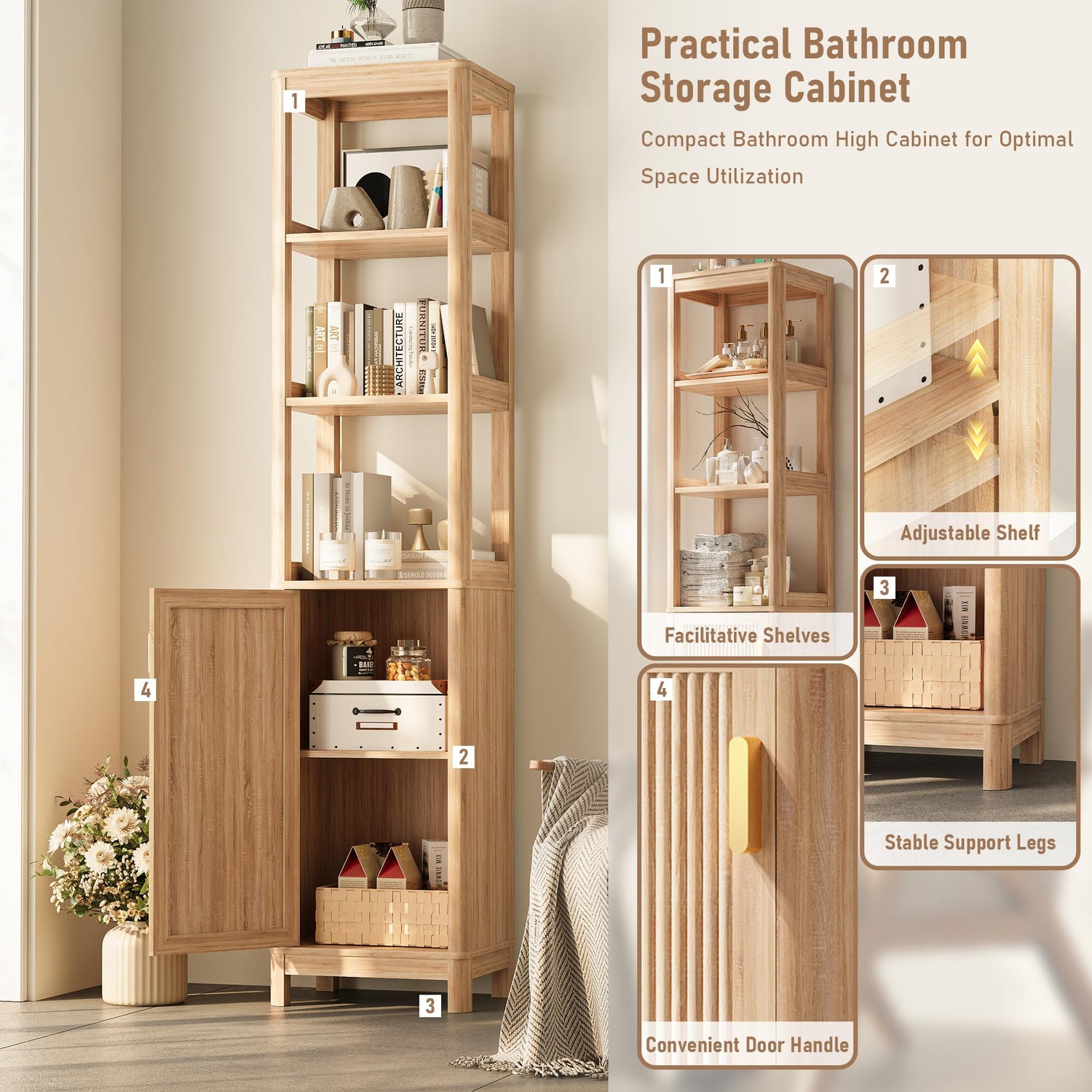 INNOD 68'' Tall Narrow Storage Cabinet with Adjustable Shelf and Door, Bathroom Storage Cabinet, Space Saver for Bathroom, Kitchen, Living Room, Natural Oak