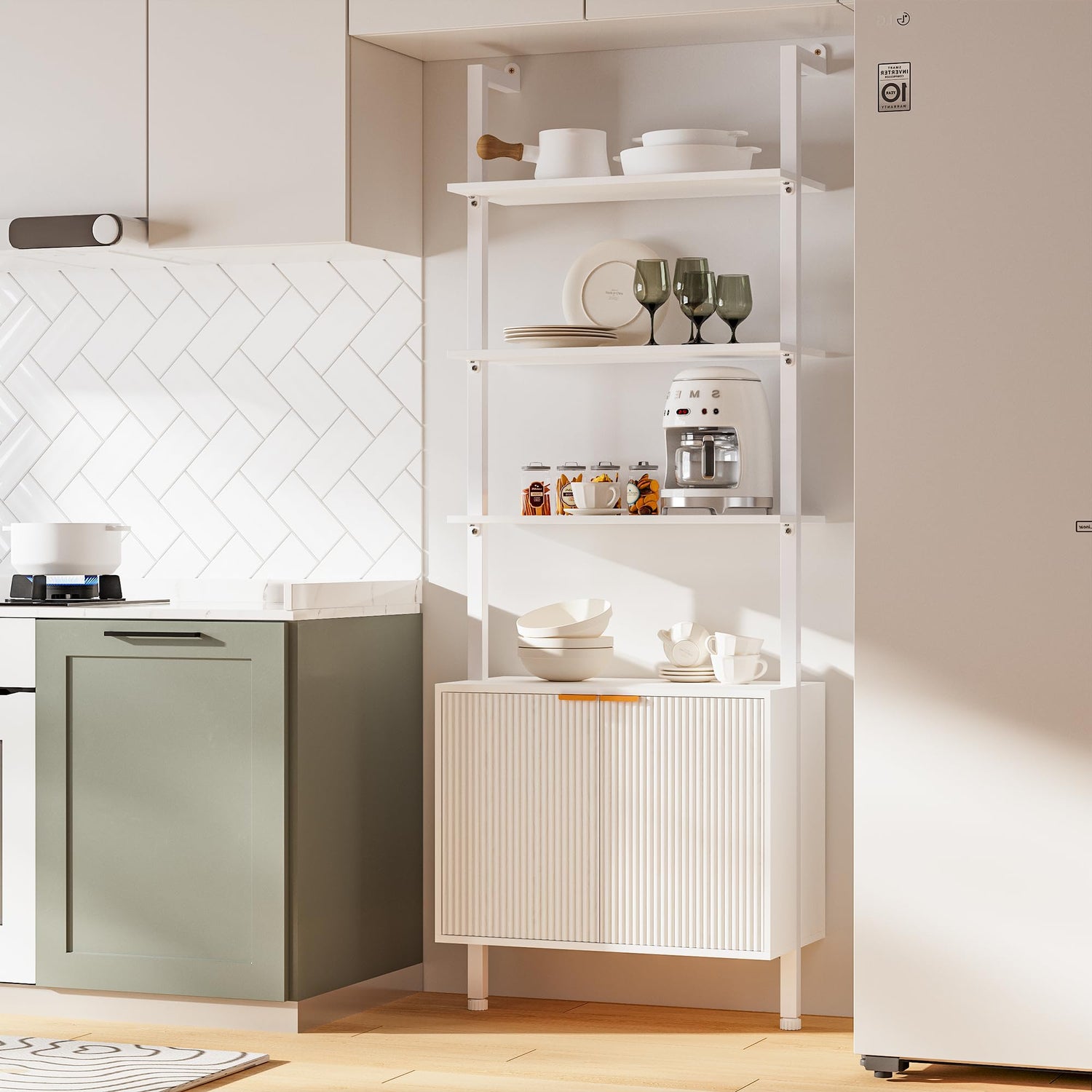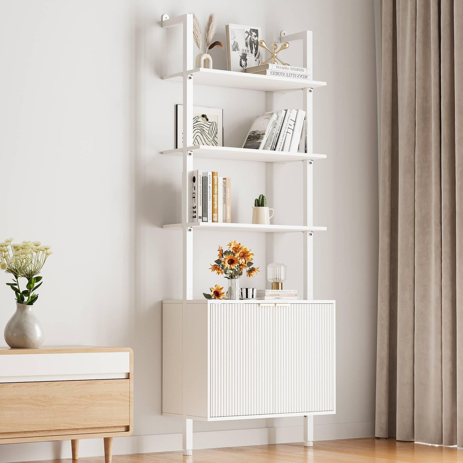 INNOD 74" Tall Bookshelf with Storage Cabinet, Modern Ladder Shelf with Wood and Metal Frame, Wall Mount Bookcase Open Display Shelf Furniture for Living Room, Bedroom, Home Office, White