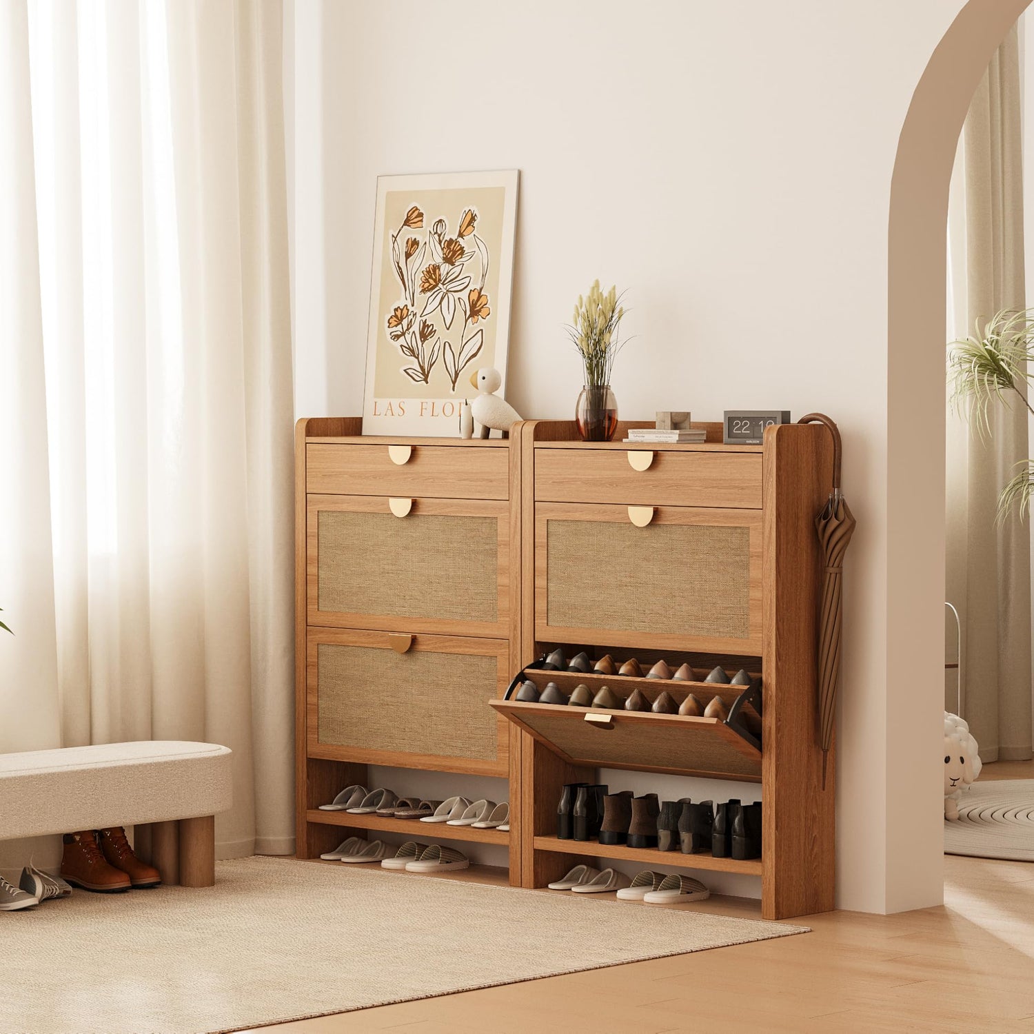 INNOD Rattan Shoe Storage Cabinet, Shoe Organizer with 2 Flip Drawers, Narrow Shoe Cabinet, Free Standing Hidden Shoe Storage, Shoe Rack for Entryway/Hallway/Closet, Natural Oak