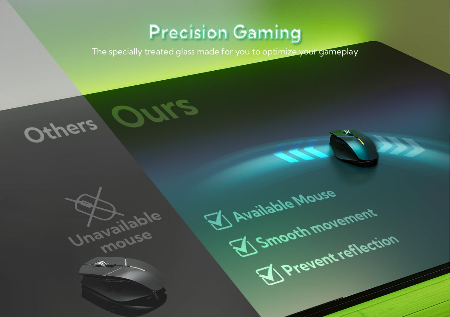 - Extra-large operating space, designed specifically for gaming: The extra-large gaming glass "mouse pad," with a 47.2"×23.6" specially treated glass desktop, is optimized for laser and optical gaming mice to ensure fast and precise mouse movement.