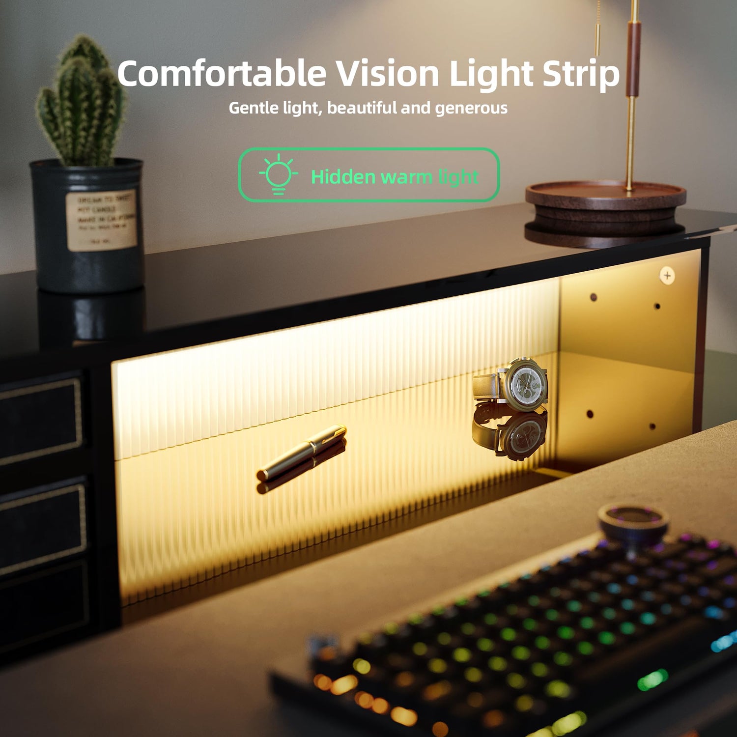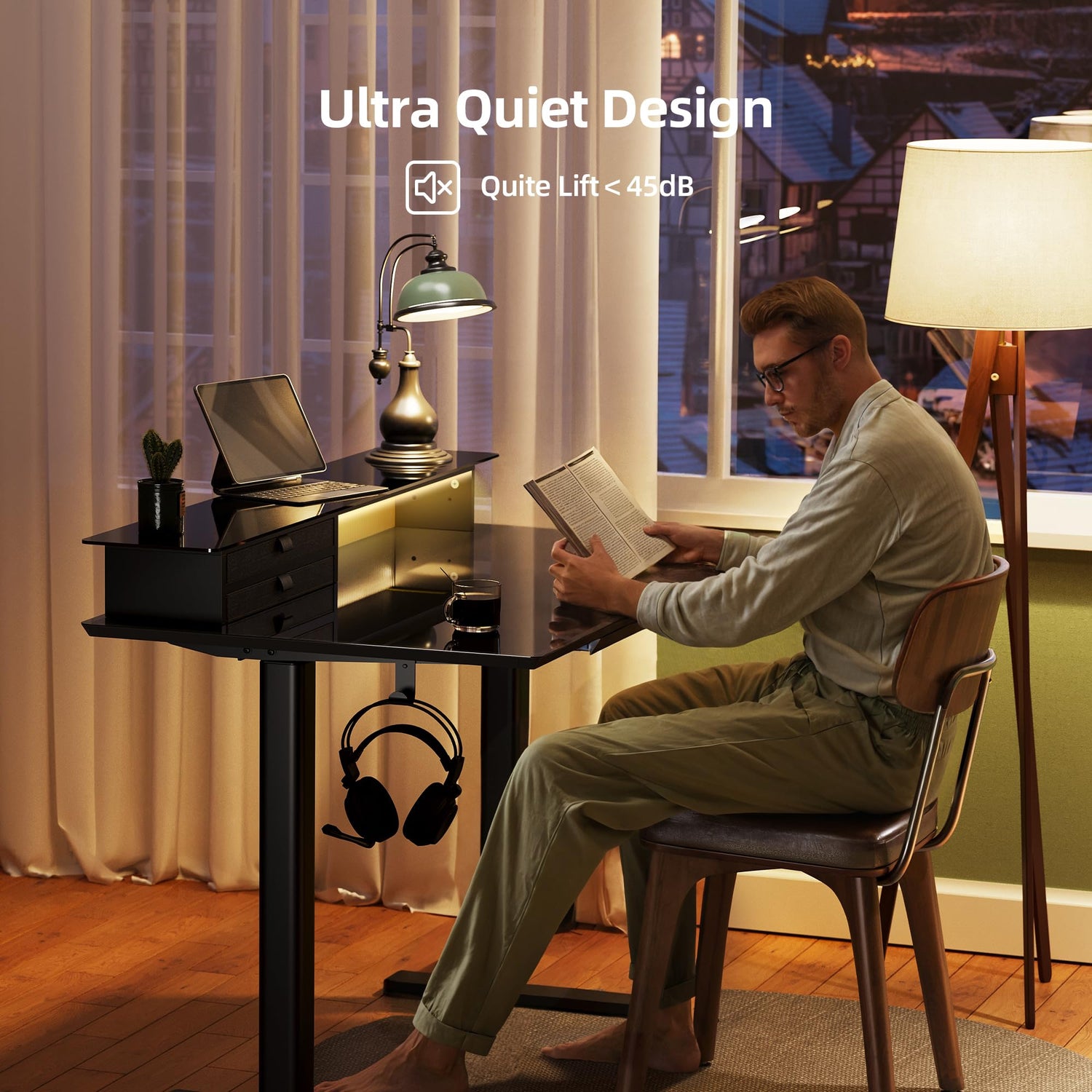 INNOVAR Glass Standing Desk with 3 Drawers, 48x24 Inch Height Adjustable Desk with USB Ports & LED Lights, Electric Stand Up Desk with Monitor Stand for Home, Office, Workstation, Black