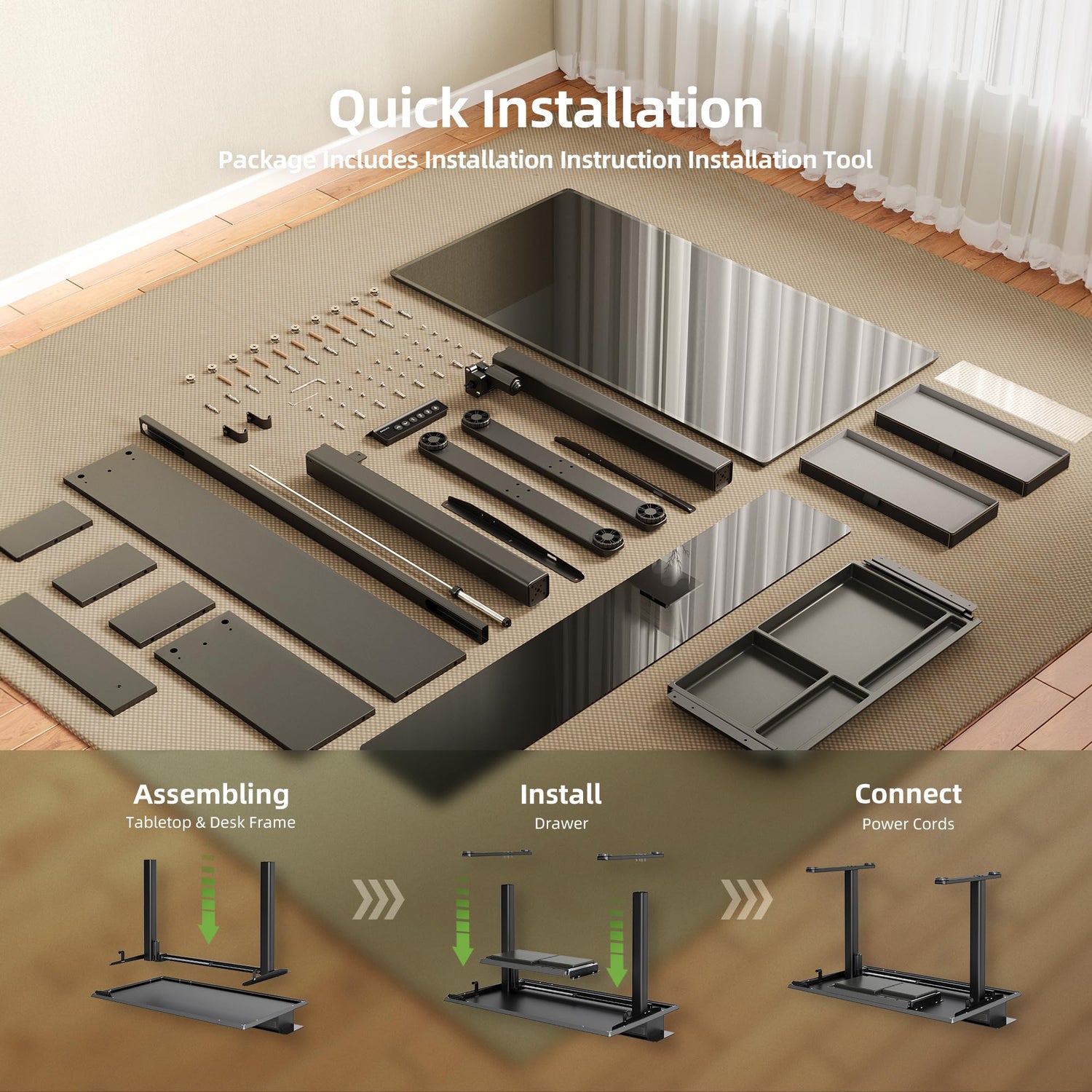 - Easy Assembly & Stability: Assembling our glass standing desk is a breeze. Durable one-piece desktop allows you to achieve a quick 3-step installation. Crafted with a sturdy metal steel frame, this standing desk can support up to 176LBS.