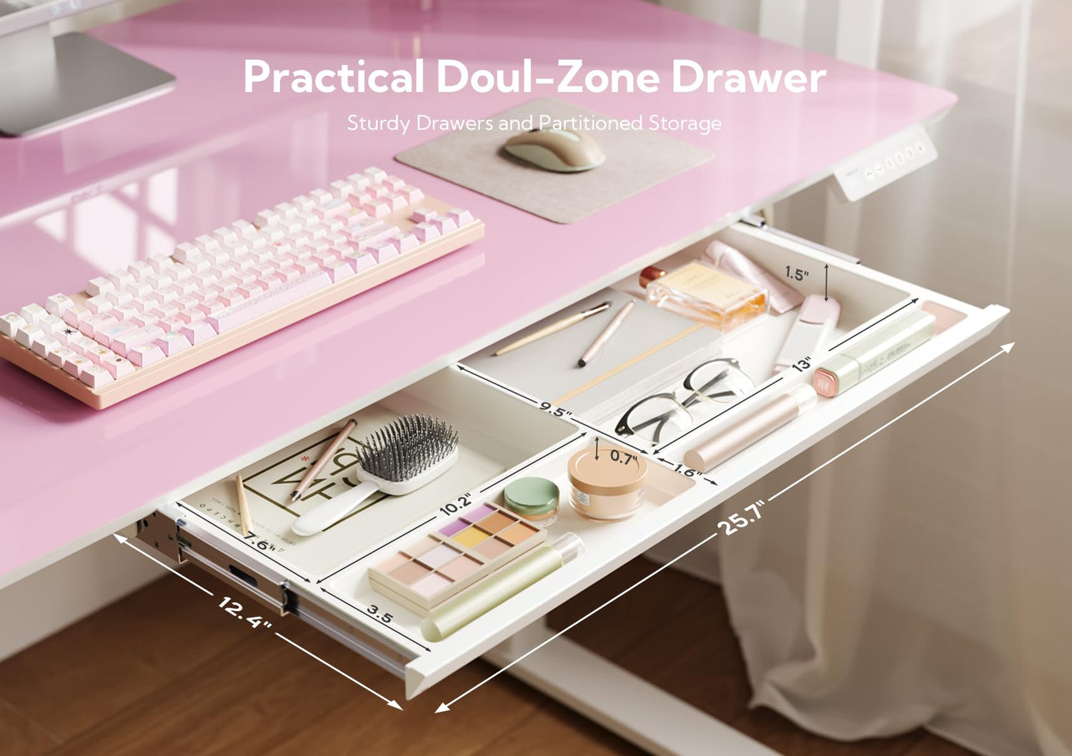 - Divider Drawer: The built-in pull-out divider drawer provides a hidden storage solution, making it easy to organize the desktop, giving you more space, and reducing clutter.