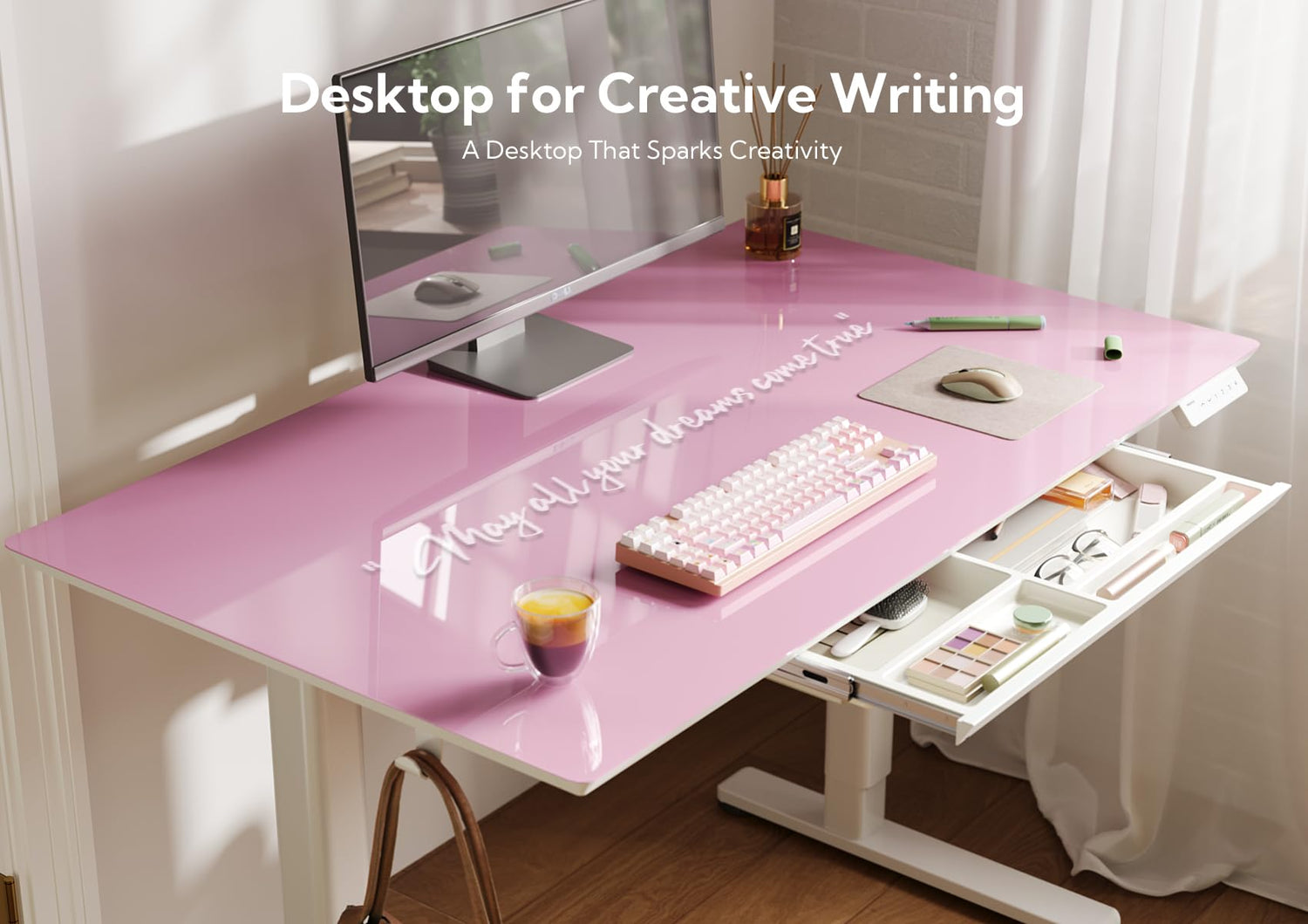 - Unique Color Design: The glass version of the electric height-adjustable desk features a design with a Morandi Powder desktop, showcasing a delicate and fashionable aesthetic. By incorporating the pink color scheme into the transparent glass material, the entire tabletop appears fresh and comfortable.