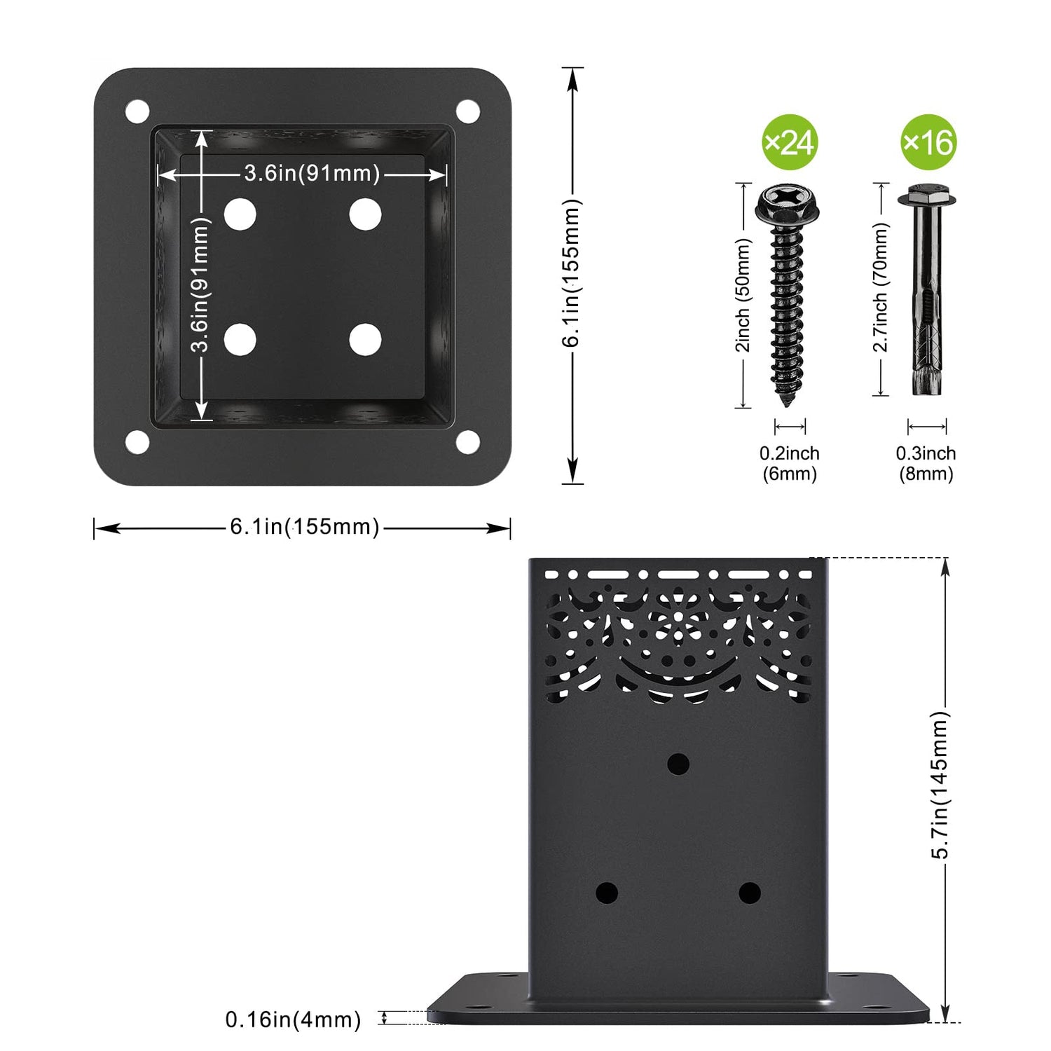 - Specification:Item size is 6''x6''x5.7'' ( inner size is 3.6''x3.6''), fit for actual 3.5"x 3.5" dry post on market, come with 24pcs of wooden screws and 16pcs of Expansion bolts;
