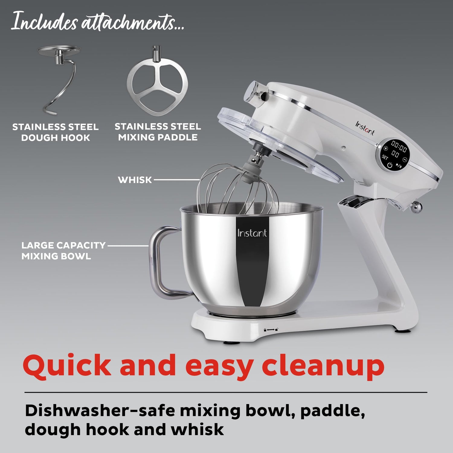 Details: The Instant® Stand Mixer Pro Series has enough power to tackle any mixing job, with powerful mixing performance, using 600 watts of power. The classic Pearl White finish perfectly complements a sleek, modern kitchen. We designed this mixer to be easy to use, with 10 speed settings and a digital timer that can count up or down. The large 7.4-quart mixing bowl tackles even super-sized recipes, but the mixer’s lightweight design is easy to transport since it’s 19% lighter than the leading stand mixer*. The included mixing paddle, dough hook and whisk are dishwasher-safe stainless steel, so clean-up is a snap.