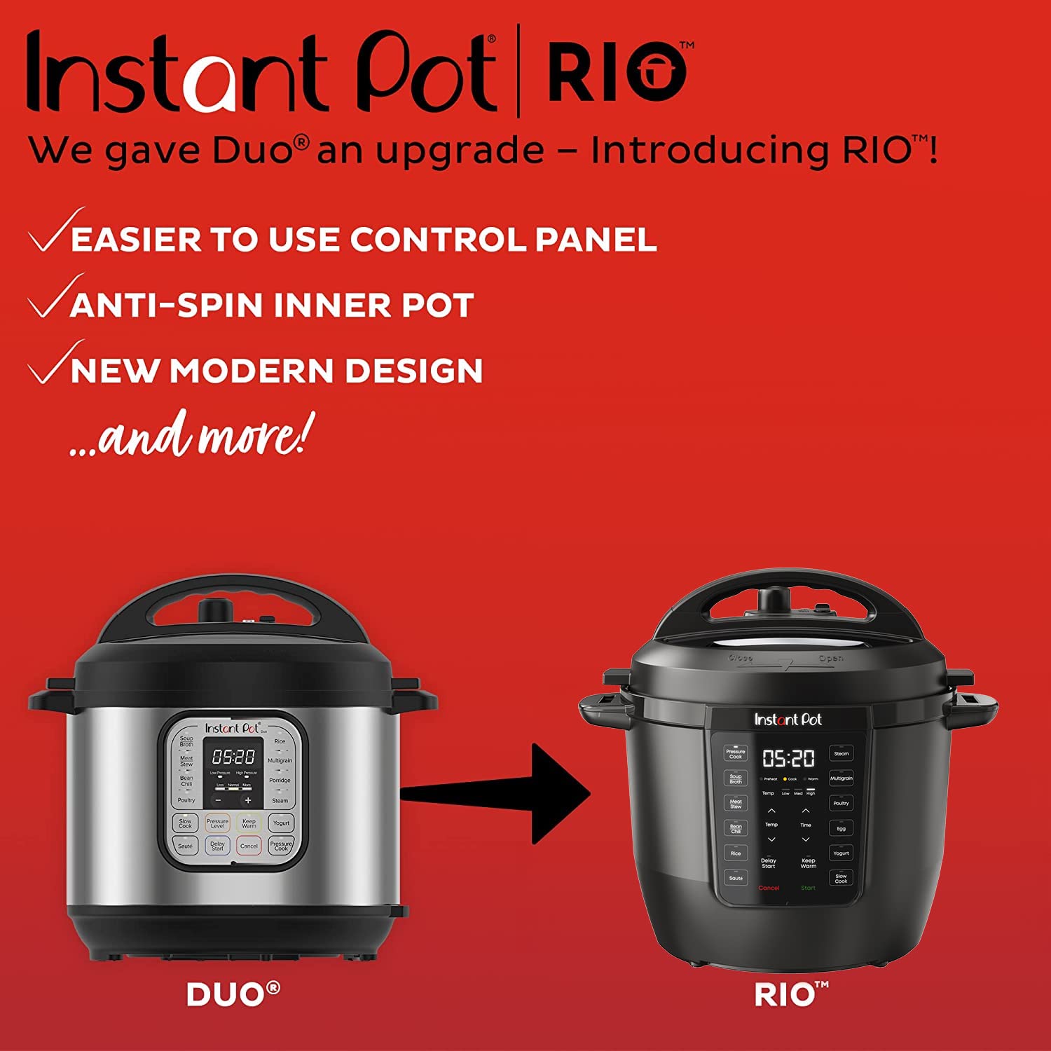 - UPDATED DESIGN: Revolutionary. Innovative. One Pot Wonder, RIO's modern slim design in matte black finish has the same great capacity and improved features you love from Instant Pot! Upgraded ANTI-SPIN inner pot for easy sauté or stirring