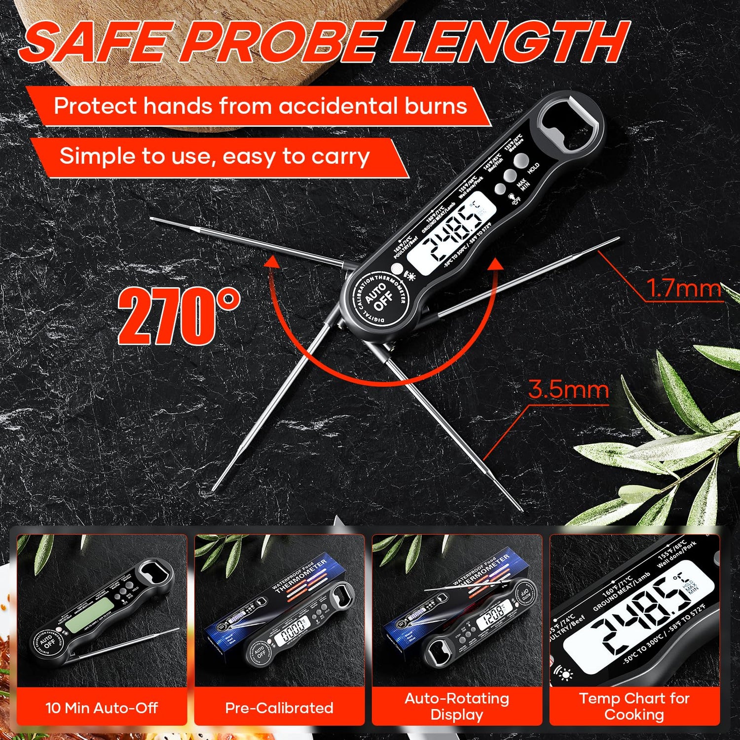 - Lock and Calibration: The food thermometer features lock function to lock the temperature on the display, so you can read temp away from the heat; Keep your temperature probe always accurate through calibration function.
