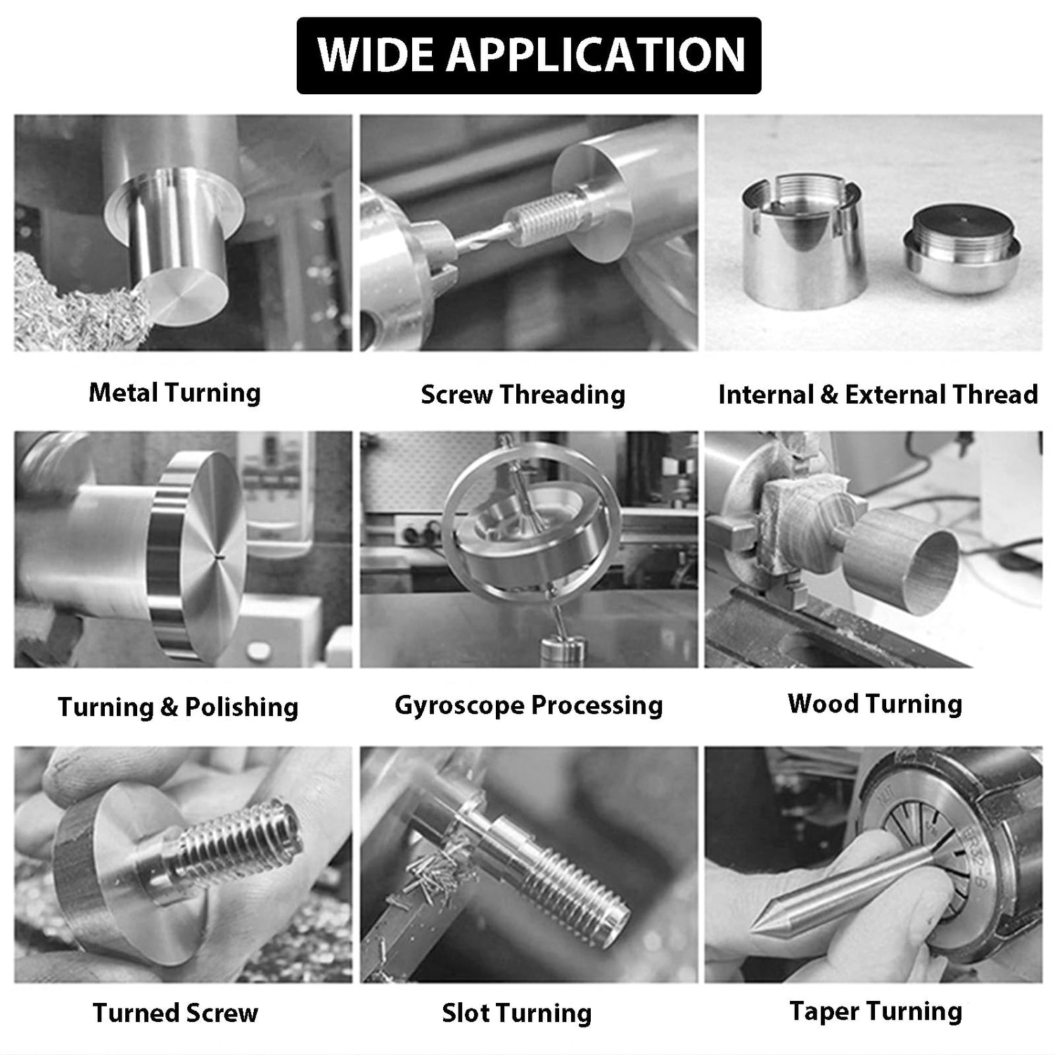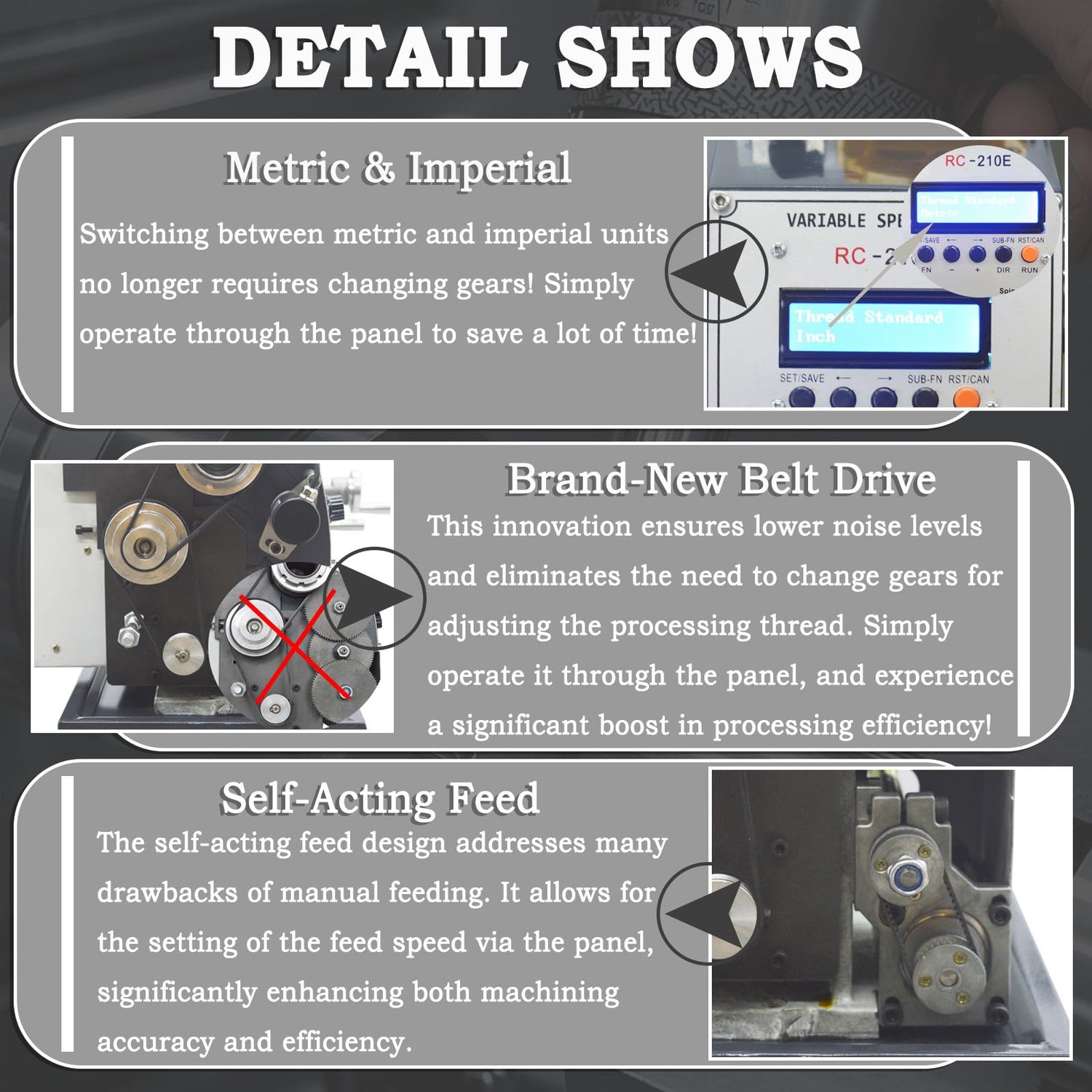 - ELECTRONIC GEARLESS DESIGN: This electric gear lathe boasts a new gearless design coupled with a brand new belt drive system,enabling it to automatically switch between metric and inch systems without the need for changing gears.It is equipped with an electronic lead screw that eliminates the hassle of manually changing gears,making it a more efficient and convenient lathe for users