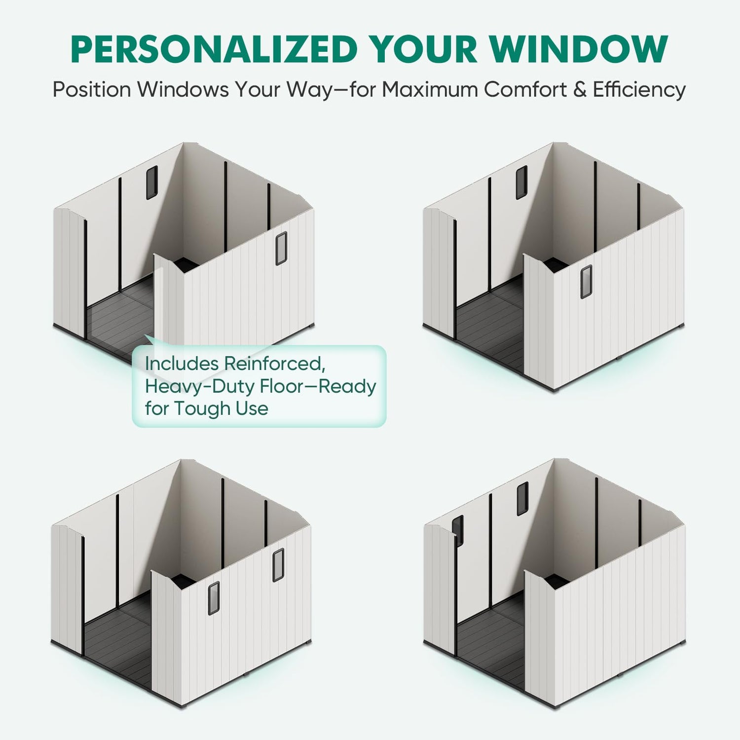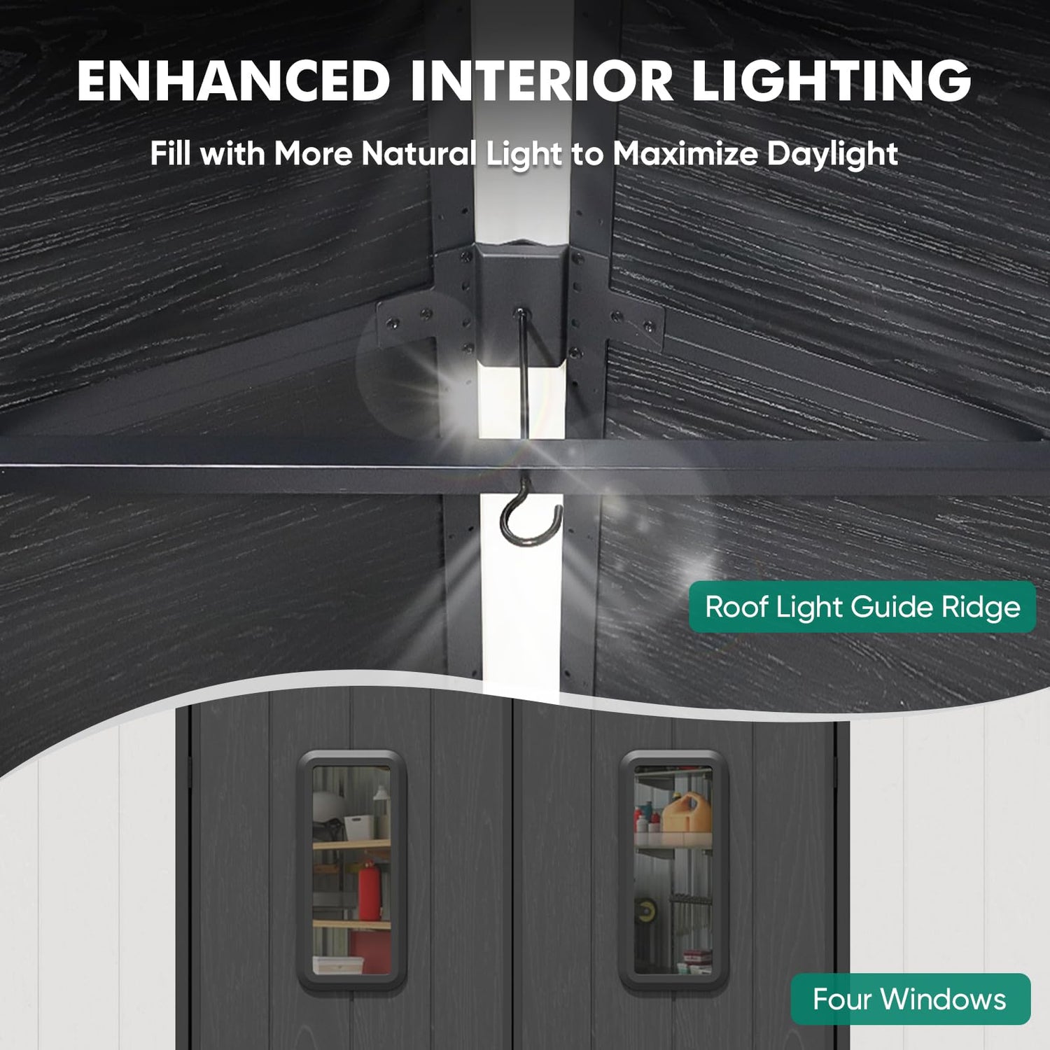 • PREMIUM UTILITY SHED SOLUTION: Designed with 4 side windows and a roof light guide ridge, this storage shed maximizes natural light, creating a bright and welcoming interior. The 2 strategically placed air vents promote excellent airflow, preventing moisture buildup and maintaining a dry environment for your belongings