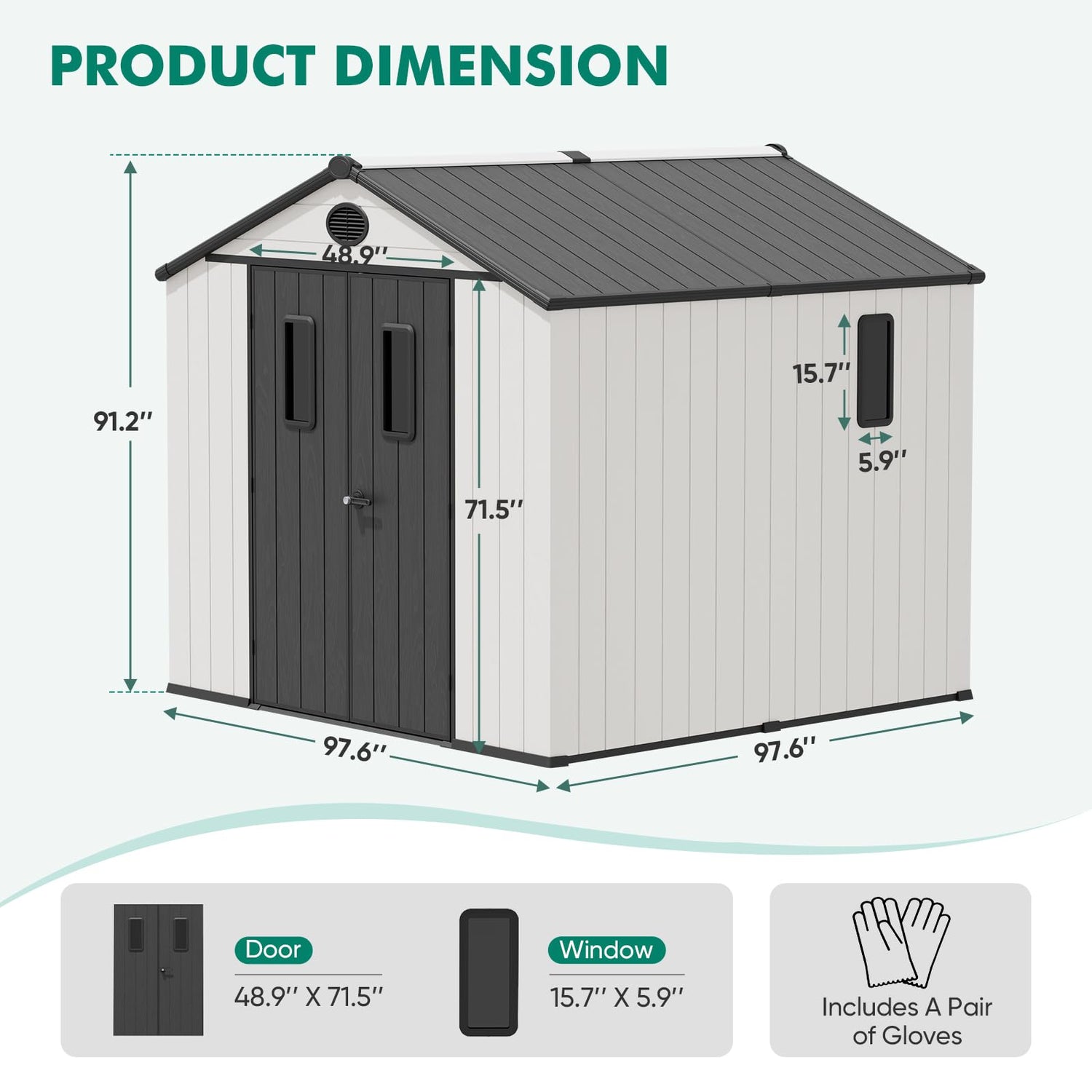 • MAXIMIZED STORAGE SPACE: This large tool shed, with dimension of 97.6''W x 74.4''D x 91.2''H, accommodates diverse outdoor essentials, tools, equipment, bicycles, and more. Strategically designed with an overhead hook, the ceiling maximizes vertical storage for frequently used items like shears and power tools. Every inch engineered for smart spatial management, keeping a clutter-free and efficient organization