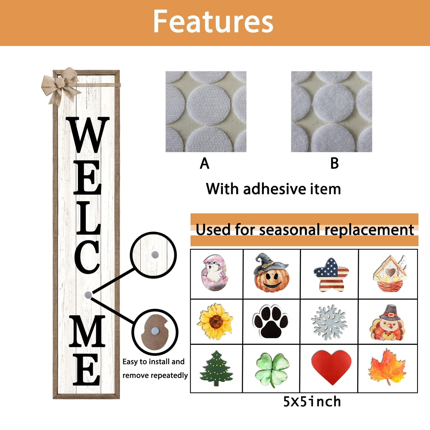 - 【Highquality Craftsmanship】: the hanging vertical welcome sign for front porch is made of natural and quality wood material, sturdy and reliable to use, Each seasonal decor comes with strong stickiness on the back, You can easily replace each slices.