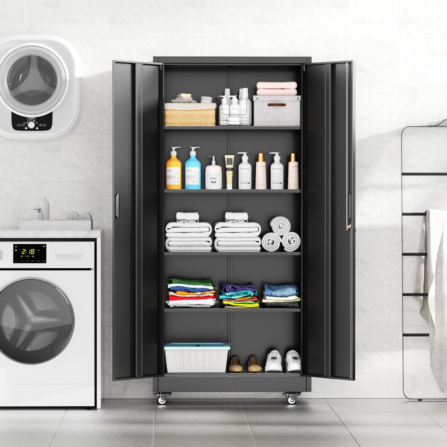 - Spacious & Adjustable 5-Tier Storage Cabinet:72" Tall Metal Storage Cabinet with 5 spacious tiers and 4 adjustable shelves, offering customizable garage & office storage.Storage cabinet with wheels perfect for organizing tools, supplies, and home essentials with 1,800+ cubic inches capacity (72"x36"x18").