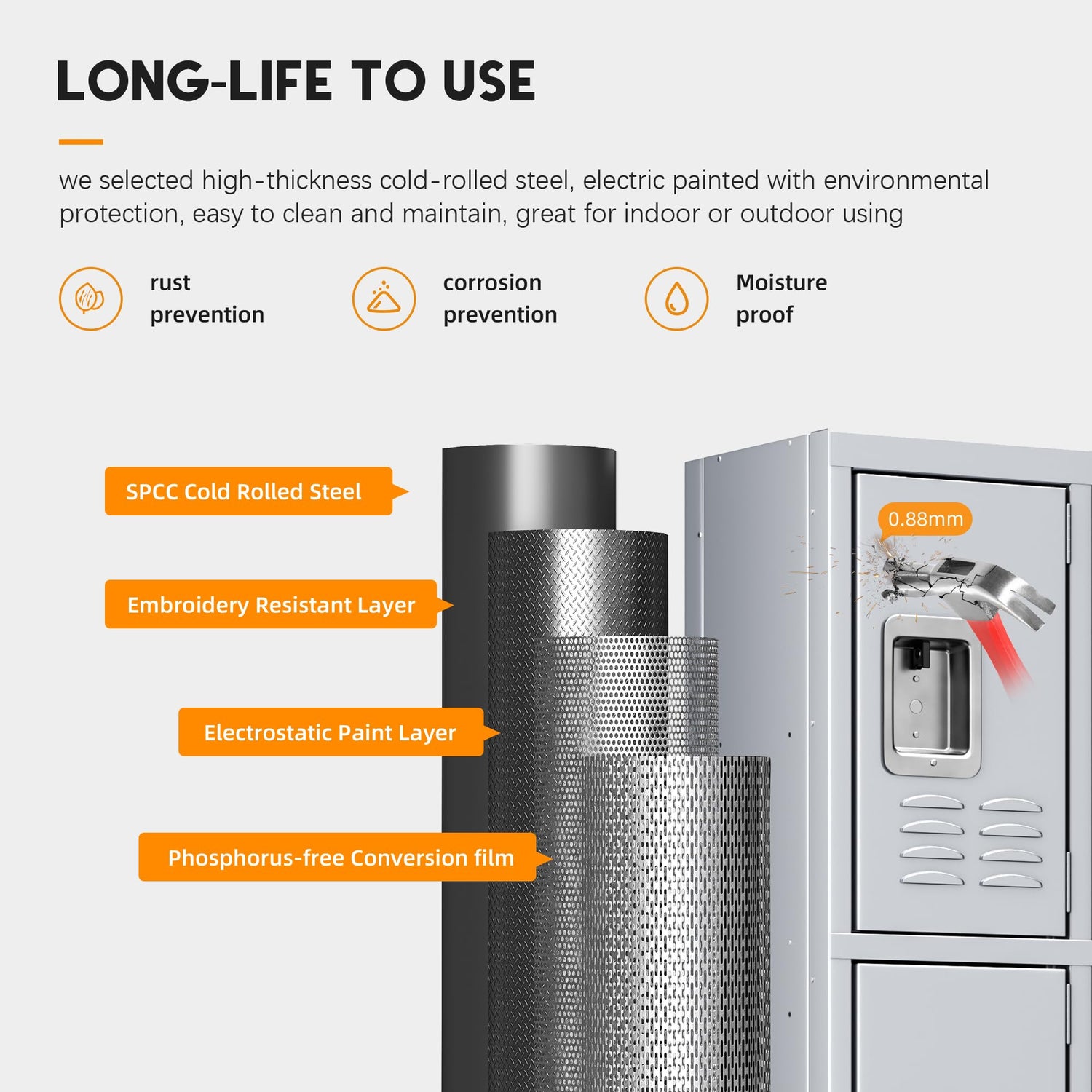 - 【Stability and Durable】The locker cabinet is made of 0.88mm steel and the door panel's thickness is 1.2mm. Metal locker with 5.9" high legs can avoid moisture on the one hand, and facilitate cleaning on the other hand.