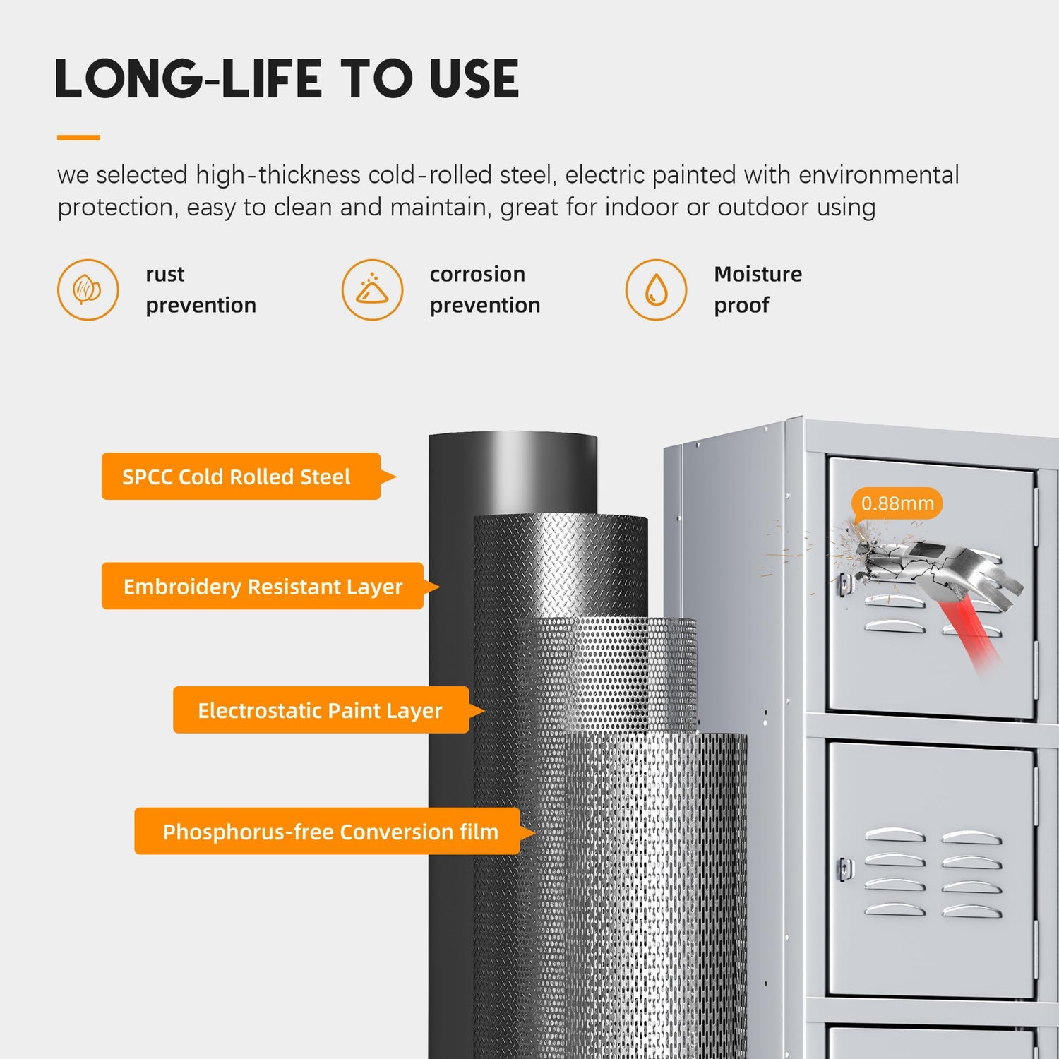 - 【Stability and Durable】The locker cabinet is made of 0.88mm steel and the door panel's thickness is 1.2mm. Metal locker with 5.9" high legs can avoid moisture on the one hand, and facilitate cleaning on the other hand.
