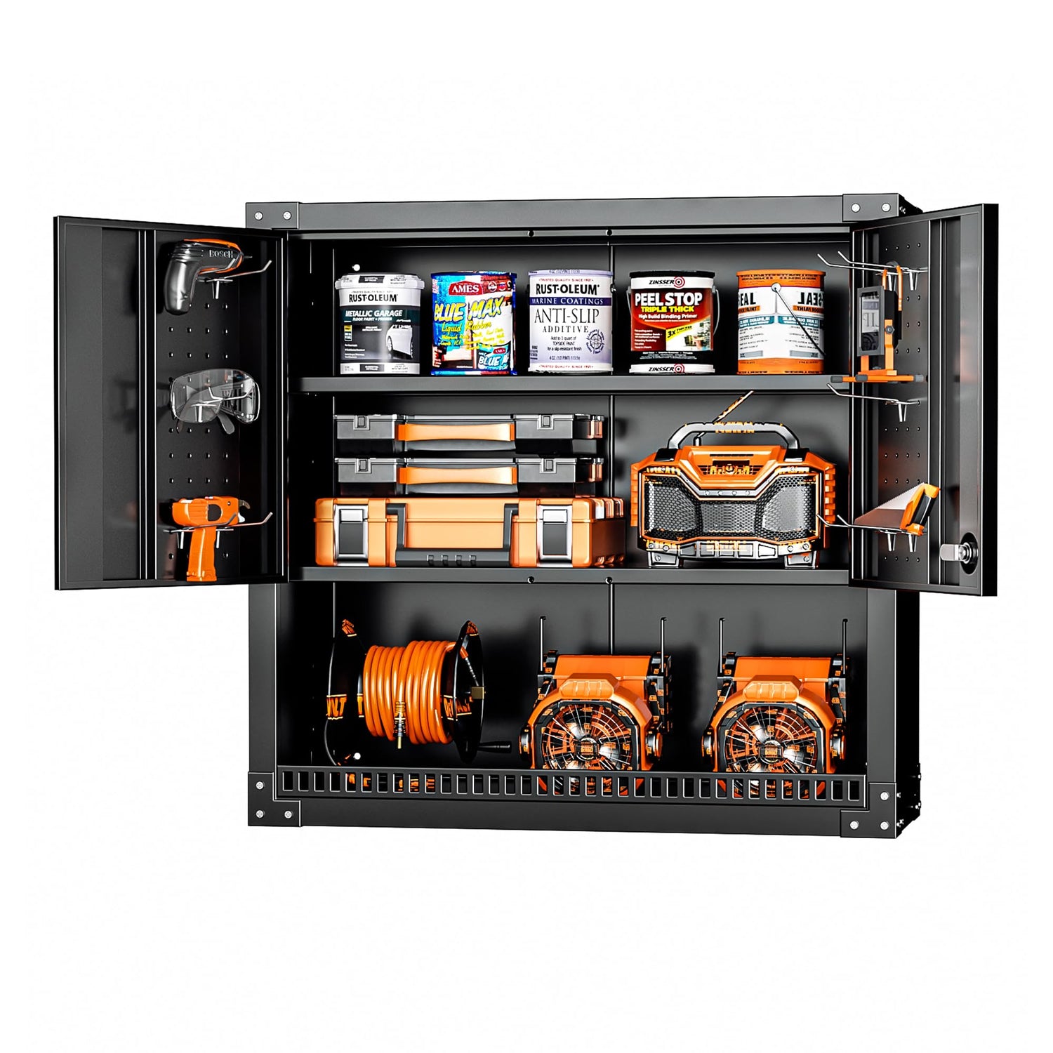 - [High Quality Material]: Intergreat metal garage wall cabinet is made of cold-rolled steel plate, with a sturdy metal frame and a load-bearing capacity of 120 pounds per floor. The thickened perforated door panel design allows for the insertion of the included 10 hooks, increasing storage space. Lockable metal wall cabinets are suitable for storing various tools, documents, tableware, etc.