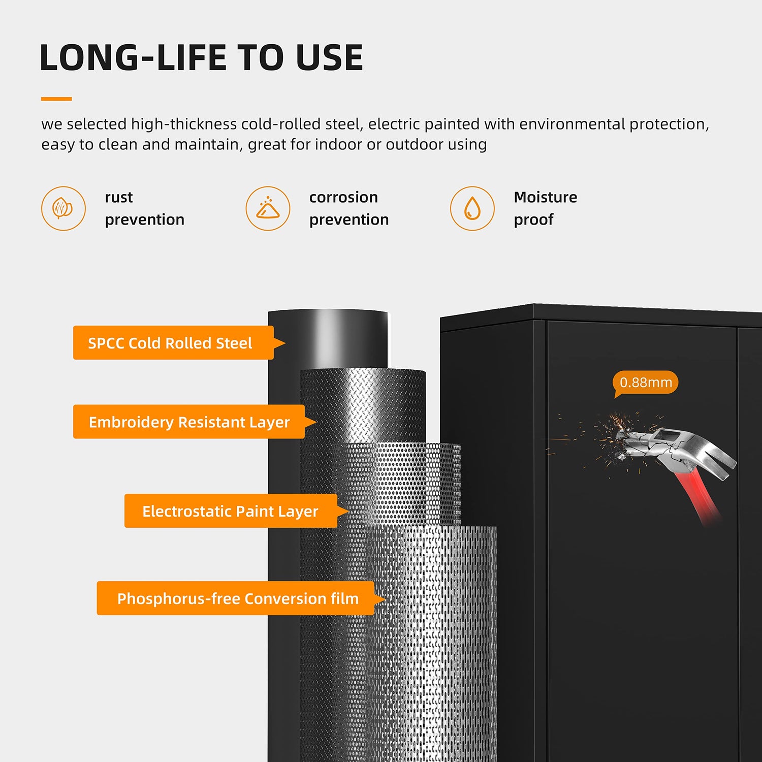 - 【Considerate Design】: The upgraded lockable lockers are designed to be more practical. Each door with rubber buffers, which will reduce the noisy while closing door, and avoid the door from scratches. Adjustable shelves make it easy to customize your storage cabinet space.
