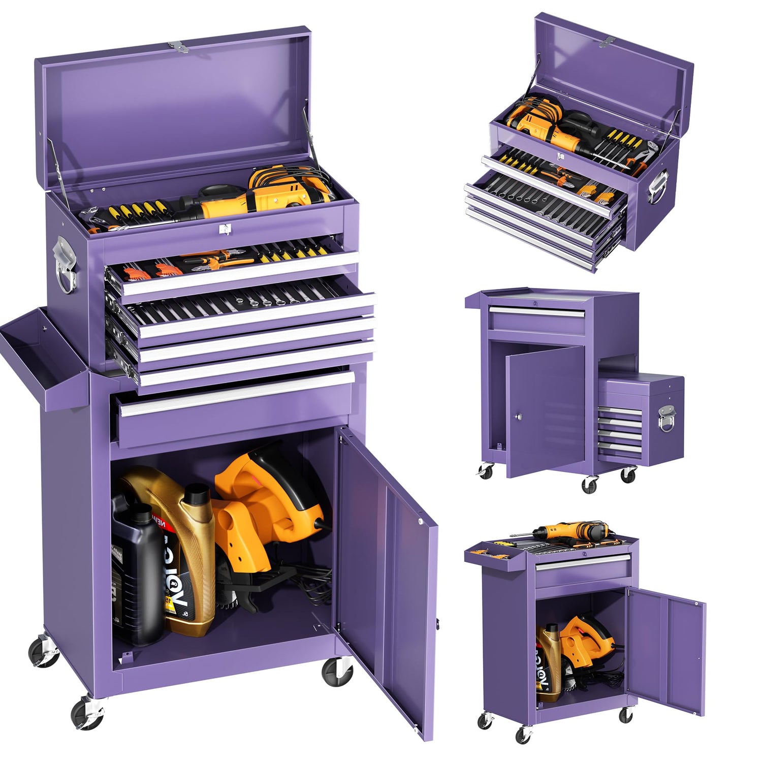 INTERGREAT Purple Tool Chest, 5-Drawer Rolling Tool Storage Cabinet with Detachable Top Tool Box, Tool Chest with Universal Lockable Wheels, Metal Tool Cart for Garage, Workshop, Barbershop