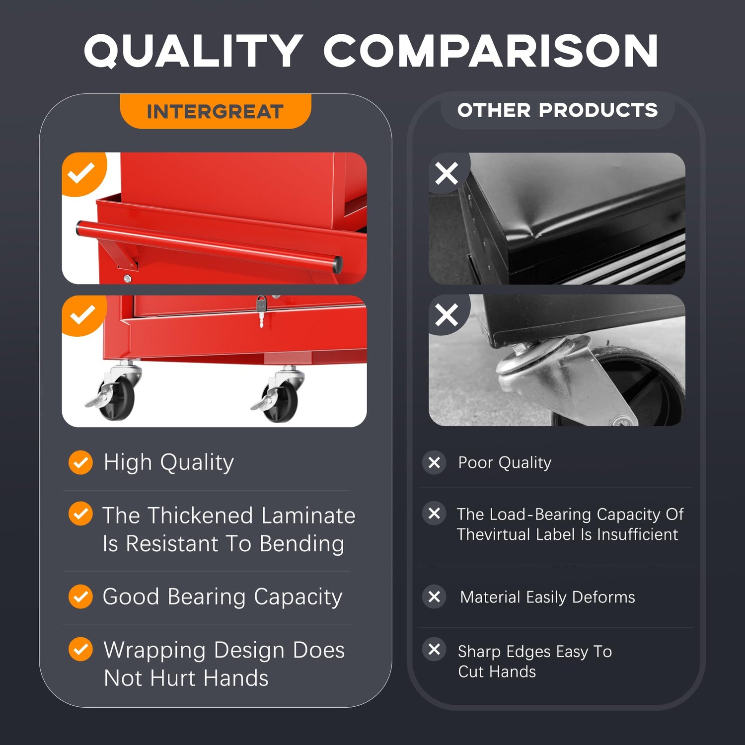 - 【Easy to Clean】 Our heavy-duty tool chest is rustproof, scratch-resistant, and easy to clean. The EVA padding inside drawers provides excellent cushioning and heat insulation, protecting your tools from damage.