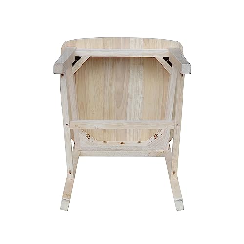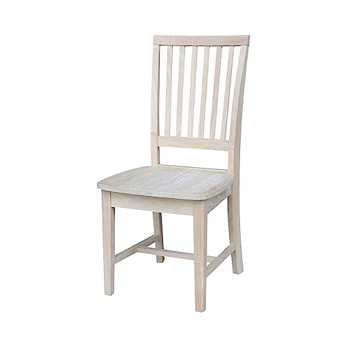 Details: This set of two International Concepts Mission Dining Chairs provides a brilliant combination of classic style and lasting durability. Crafted from solid hardwood, these unfinished chairs come ready to be stained and painted to match your unique home decor. The traditional Mission-style design features slat back detailing and square legs for a timeless feel. This set of chairs adds a sophisticated touch of elegance to your kitchen, dining room, coffee bar, or any other living space. These chairs are comfortably sized, ideal for those long meal-time conversations. Each chair has a seat height of 17. 7 inches. The chair dimensions are 18. 3” W x 21. 3"D x 39. 2”H, and the seat dimensions of each chair are 17. 7'' H x 18. 31” W x 16. 34" D. With a weight capacity of 300 lbs, these sturdy dining chairs are perfectly suited for larger individuals. Bring comfort and style to your dining area with this International Concepts Set of Two Mission Side Chair. Crafted from solid hardwood and designed in the traditional Mission-style, this set is perfect for instantly adding a sense of sophistication and comfort to your home for years to come.