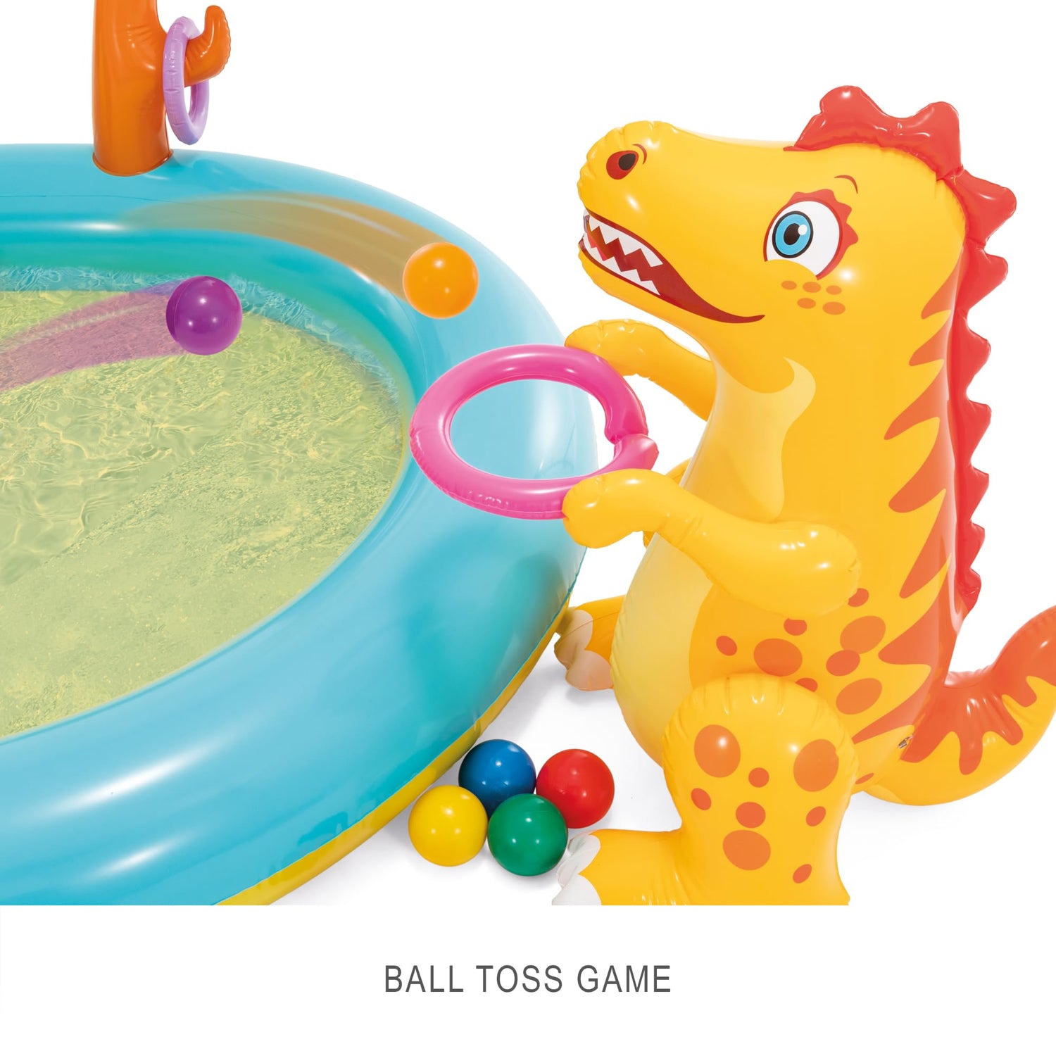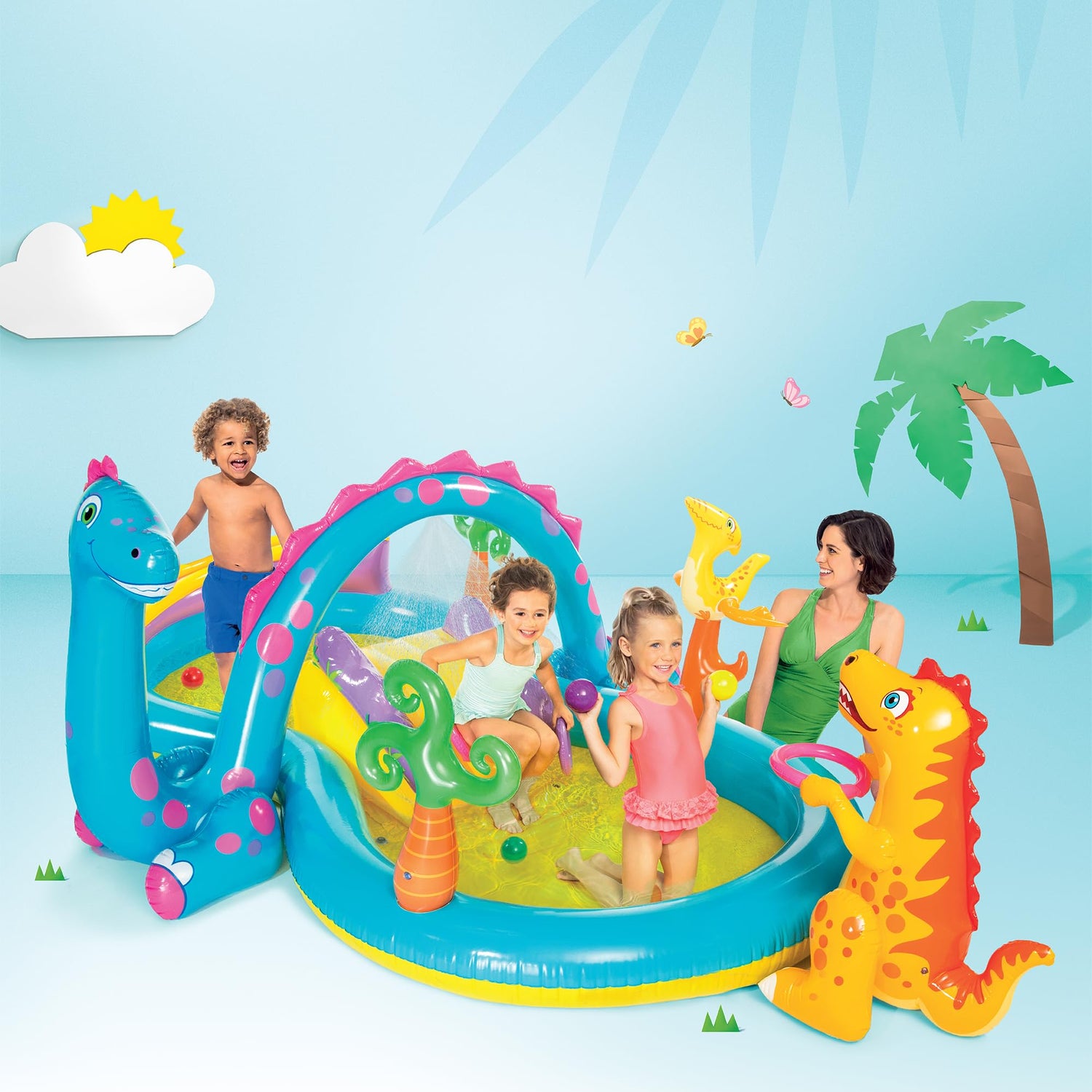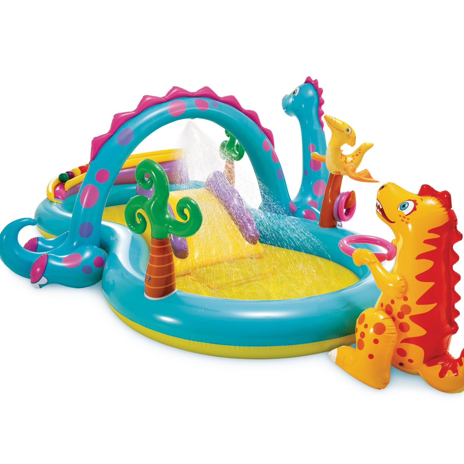 - Transform your backyard into your own mini waterpark; Slide and splash into the wading pool or have fun with Dino Hoops and Volcanic Ball Roller games