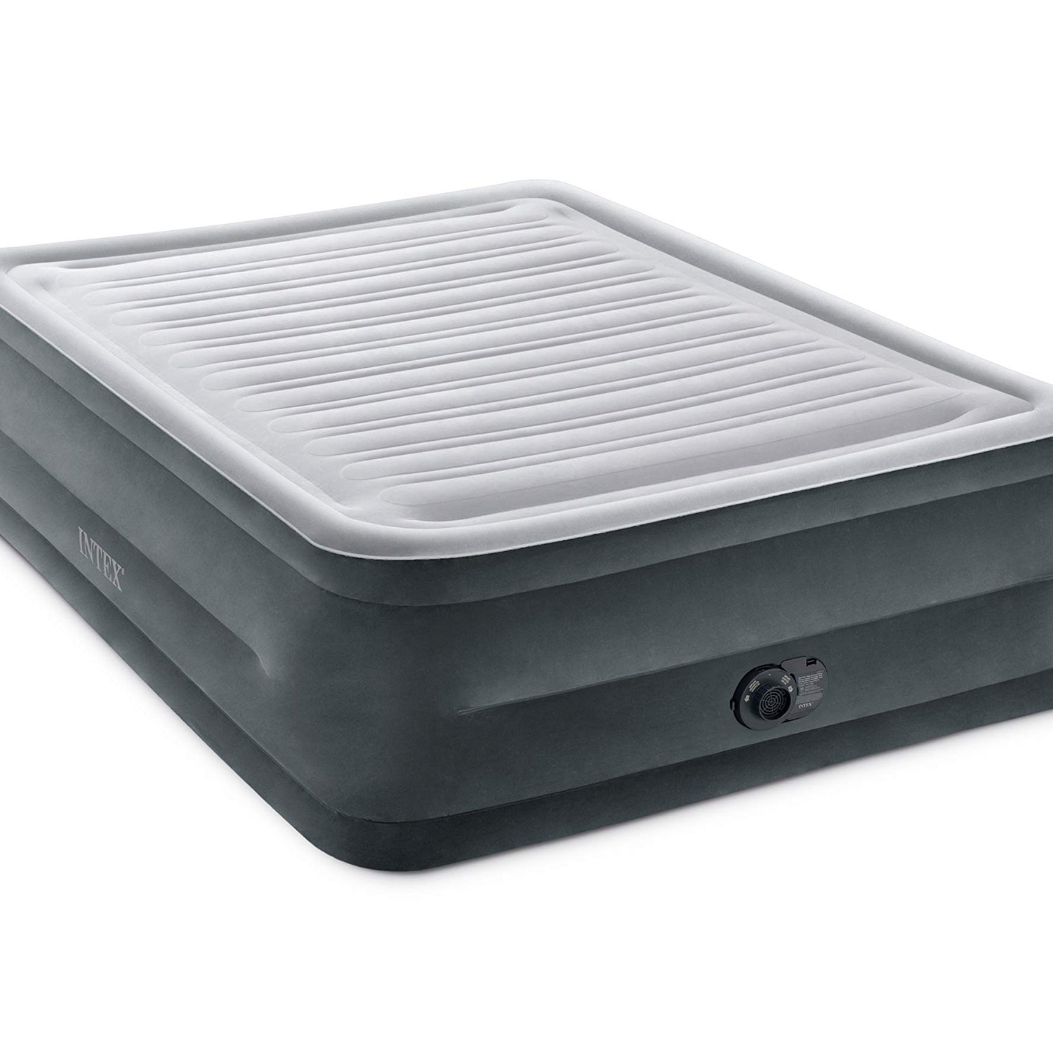 INTEX 64417ED Dura-Beam Deluxe Comfort-Plush High-Rise Air Mattress: Fiber-Tech – Queen Size – Built-in Electric Pump – 22in Bed Height – 600lb Weight Capacity,Grey