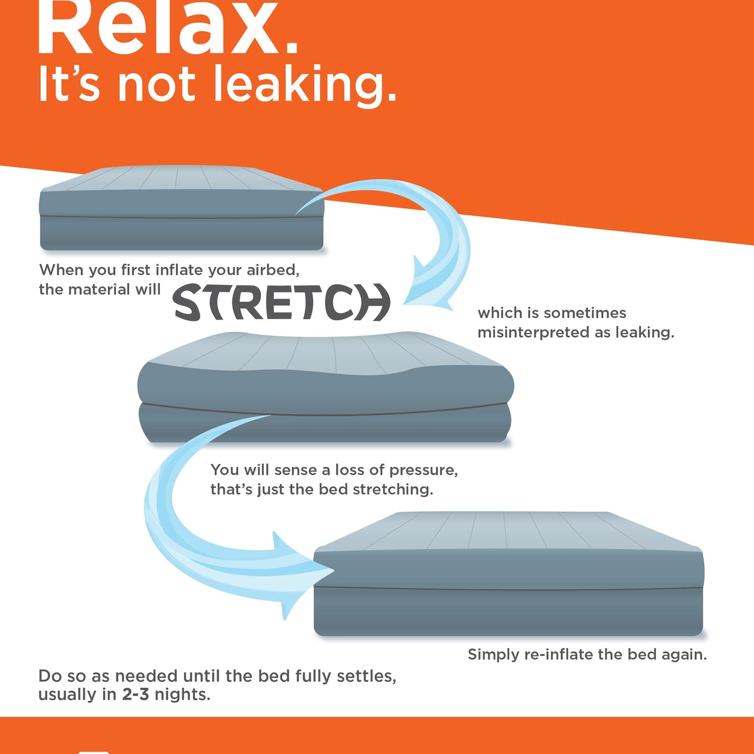 - ✔ STRETCH – At first inflation the material will STRETCH, which is sometimes misinterpreted as leaking; You will sense a loss of pressure, that's just the bed stretching, simply re-inflate the bed again; the bed will fully settle within 2-3 nights