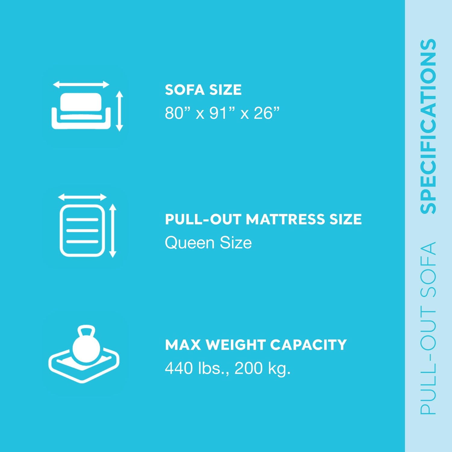 Details: Built for versatility, the INTEX Pull-Out Sofa is designed for relaxing just about anywhere. Whether you are just watching a movie and lounging , this sofa creates a comfortable space. Having house guests and need extra space? Simply pull out the cushion which turns into a queen air mattress for a good night's rest . The pull-out sofa Inflates and is ready to go in minutes with the extra wide 2-in-1 openings. Weight capacity is 440 pounds.