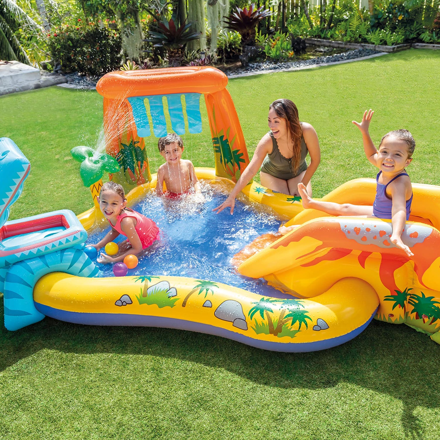 - Features a built-in palm tree water sprayer and a waterfall, effectively keeping your kids cool as they engage in their outdoor play during the hot summer months