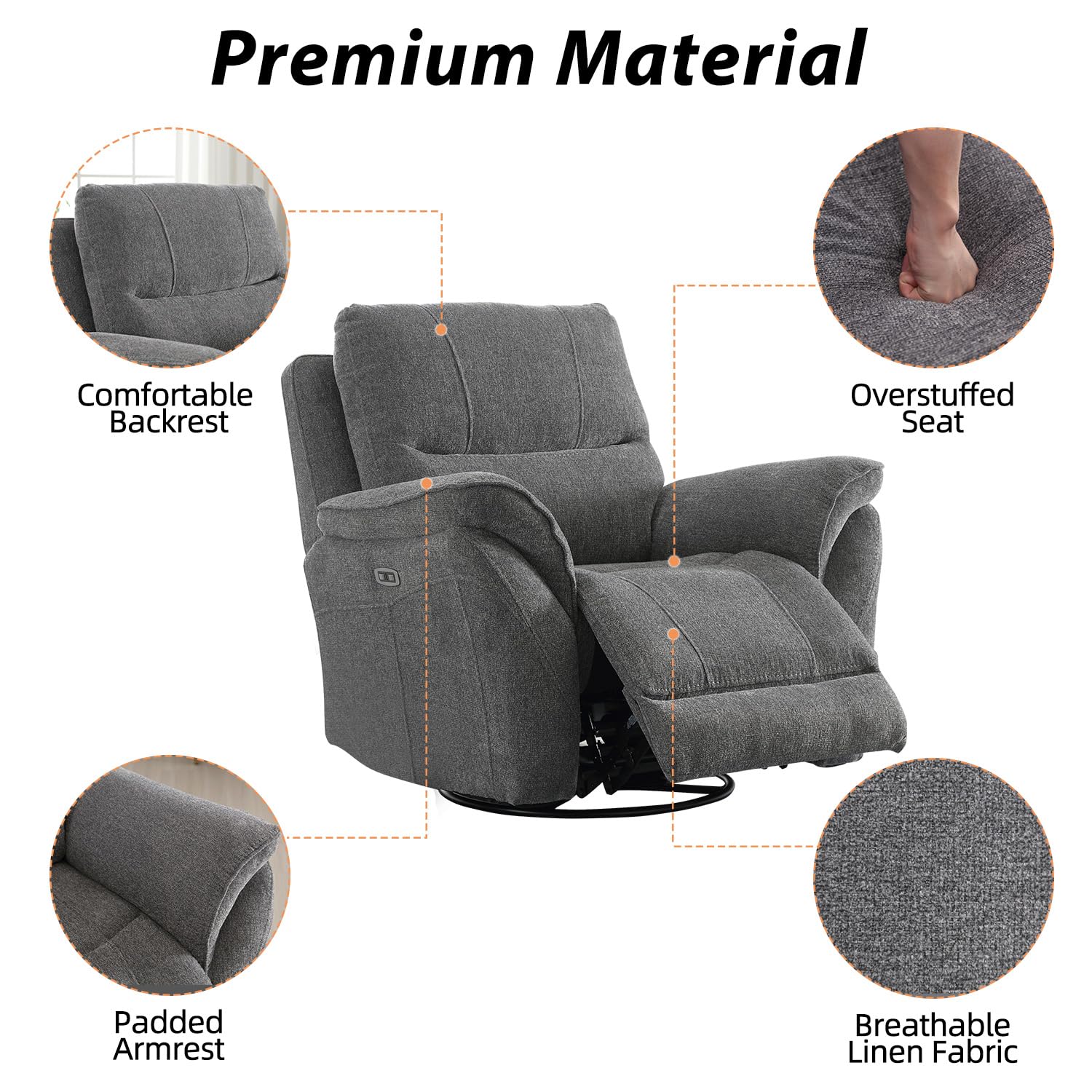 - Power Recliner and Swivel Glider-The power swivel recliner offers the convenience of power reclining, allowing you to easily adjust the seating position at the touch of a button. The swivel glider feature enables smooth rotation and gentle rocking motions, enhancing relaxation and versatility.