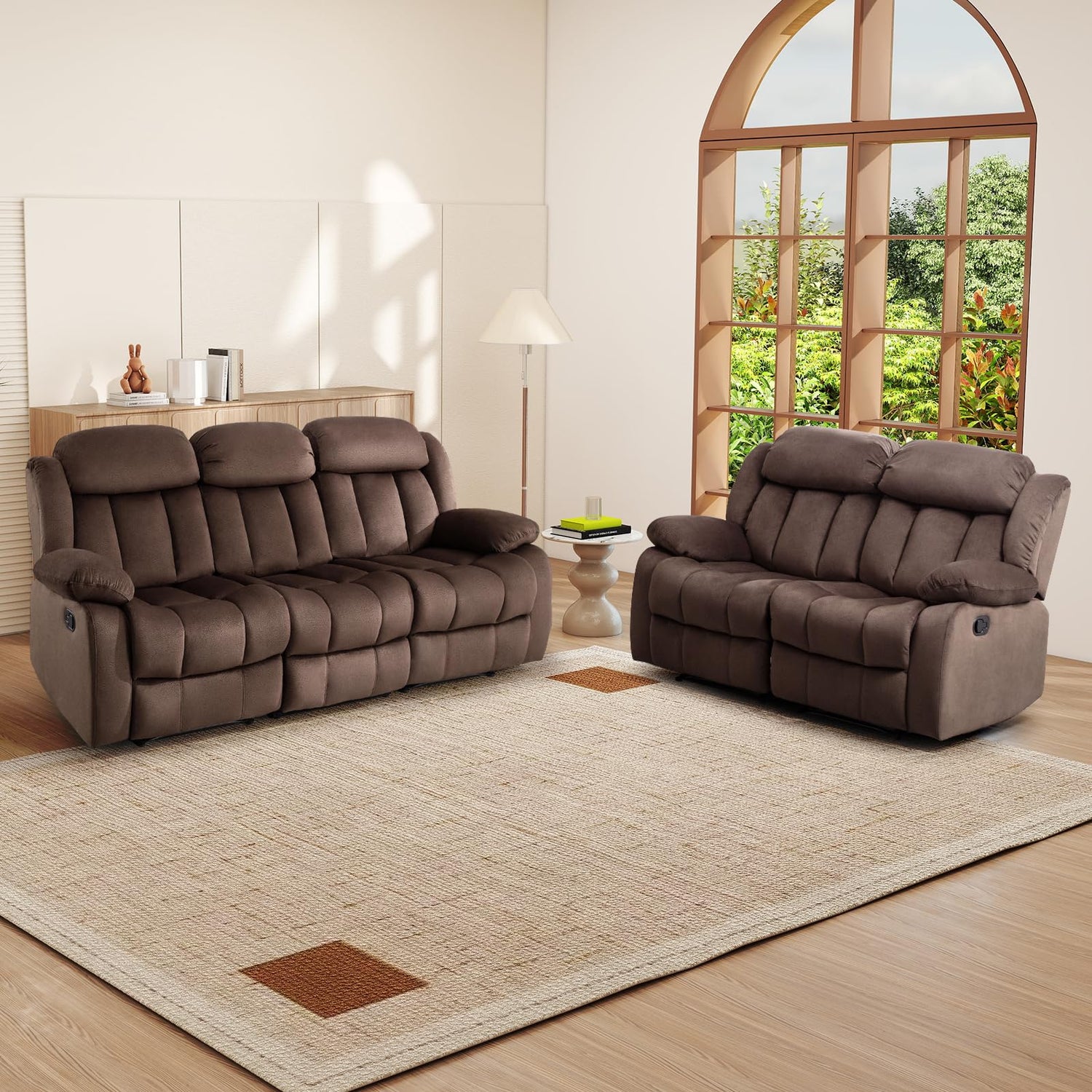 INZOY Manual Reclining Sofa Set, Included Wall-Hugger 2 Seat Recliner Loveseat and Wall-Hugger 3 Seat Recliner Sofa Coach, Modern 3 Reclining Sofa Couch for Living Room Furniture, Brown, 2+3