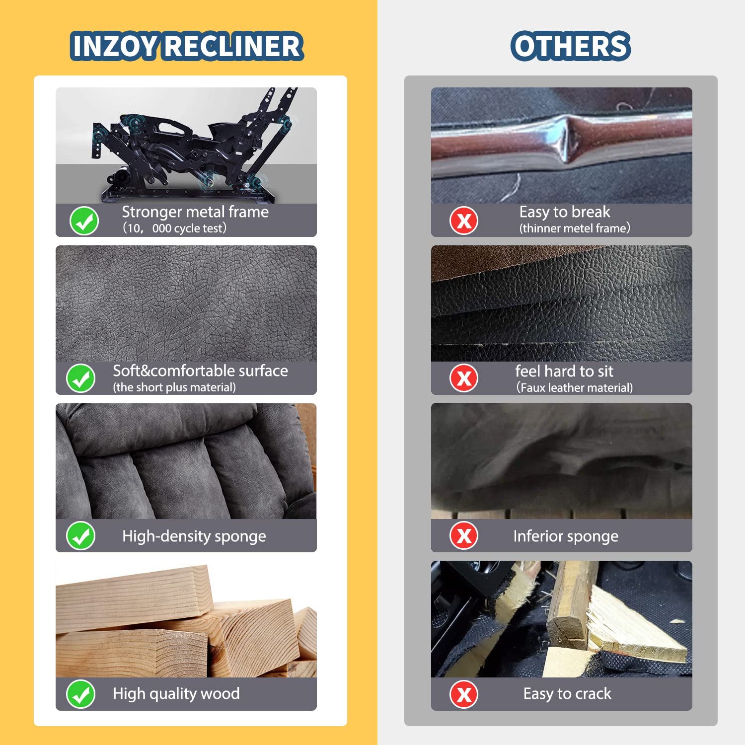 - Comfortable Material: The fabric of the massage rocker recliner is short plush, which is soft to the touch, and the color of the recliner will vary slightly depending on the direction of the pile. Luxurious breathable recliners have high-density foam and laminated veneer lumber systems to provide comfort.