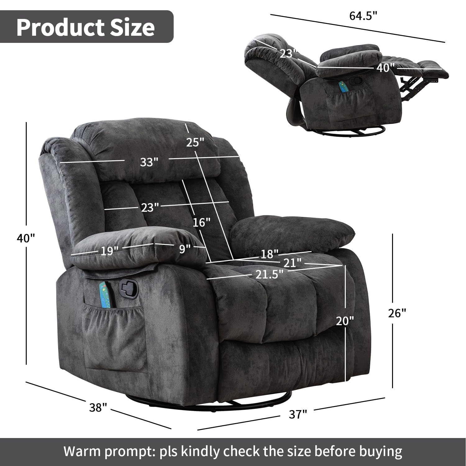 - Mordern Swivel Rocker Recliner: We added 360º swivel function for massage rocker recliner. With the gentle rocker recliner motion and pillow top armrest and soft backrest, you'll enjoy your rest time in this rocker recliner chair. Also the America style modern design bring a fresh element into your living room.