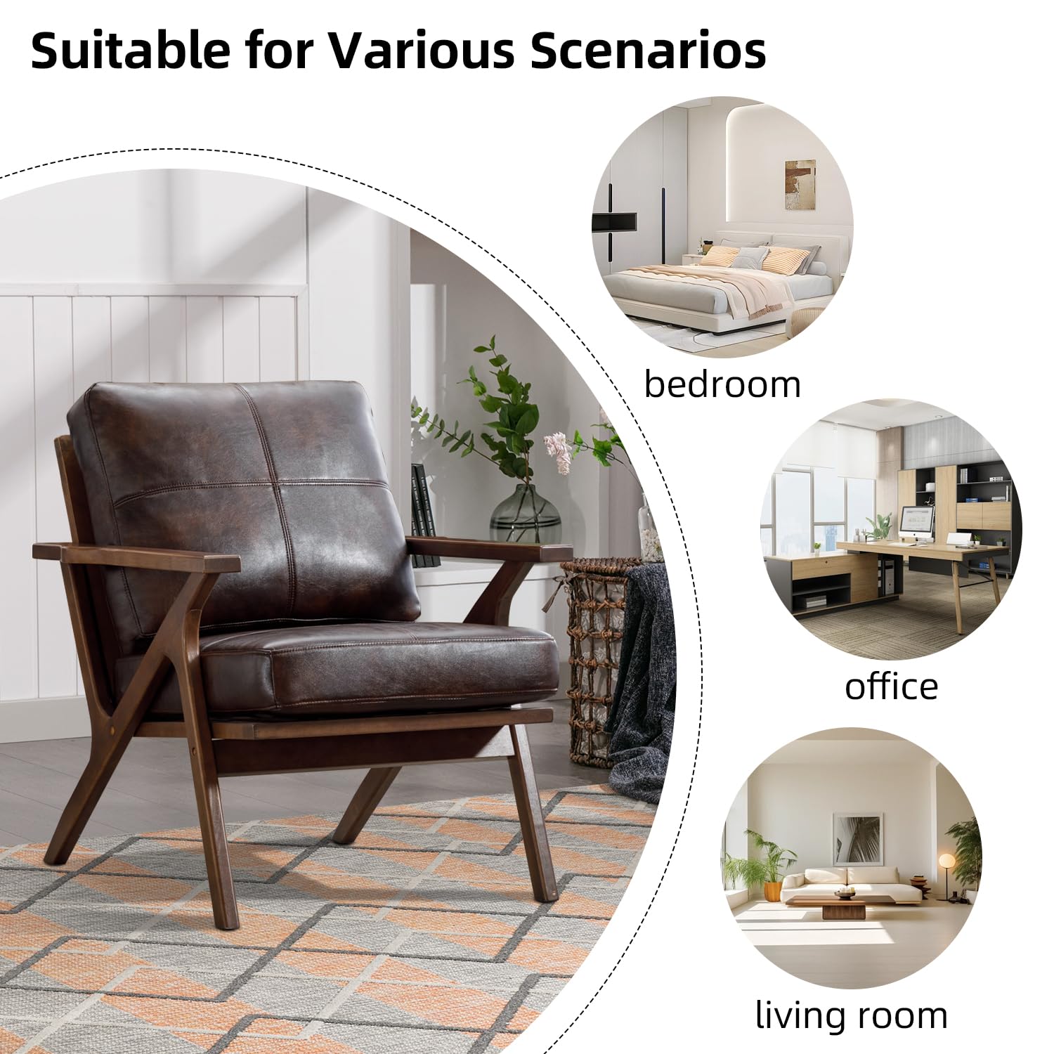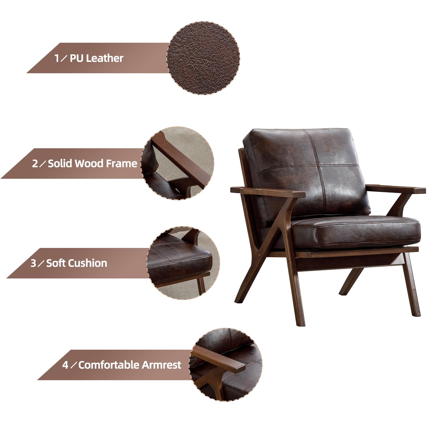 INZOY Mid-Century Modern Accent Chair with Wood Frame, PU Leather Living Room Chair and Soft Thick Padded Armchair for Living Room Bedroom Reception with Removable Upholstered Cushions, Brown